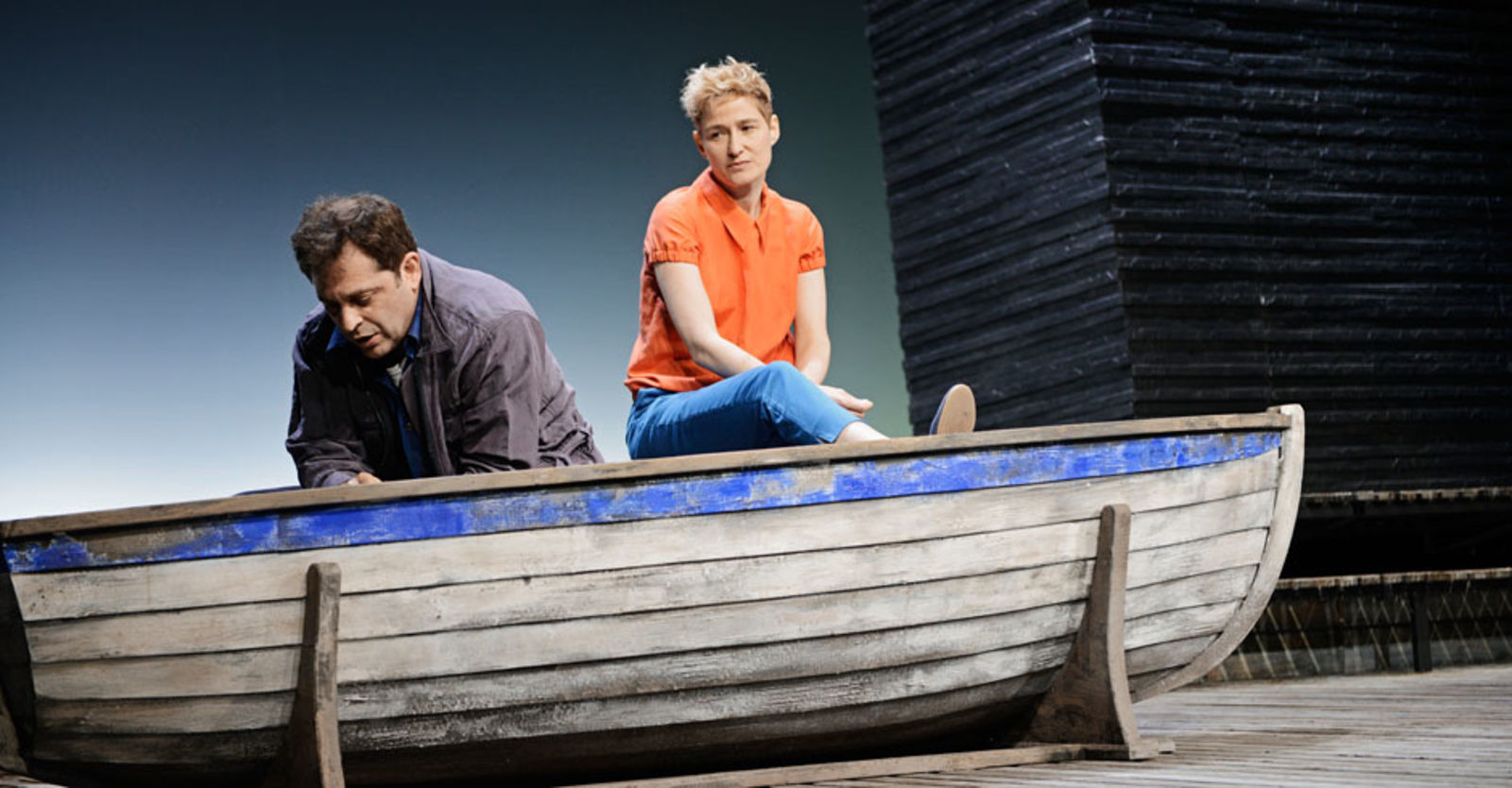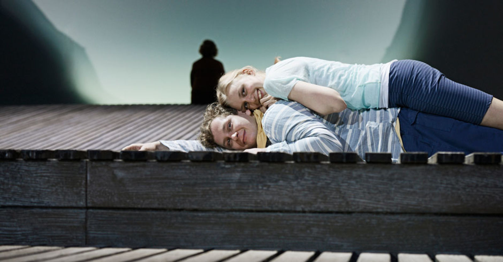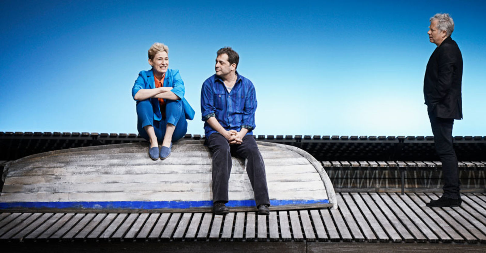 „Die Frau (Yvon Jansen) interessiert sich für Leif (Nicolas Rosat), den Jugendfreund des Mannes (Tilo Nest). Die beiden Jungen gründeten gemeinsam eine Dorfrockband; das „Schöne“, das sie verband, war wohl die Musik – und eine geheimnisumwitterte Bootsfahrt vor Jahren. Nun sehen sie sich wieder: Einen unendlichen Augenblick lang umarmen sie sich; es ist ein Augenblick der Utopie. Nicolas Rosats Leif bleibt fortan ungeschützt, vorbehaltlos offen für die grosse Liebe; Tilo Nest rettet sich in plaudernde Verbindlichkeit. Die Frau – die verzweifelt muntere Yvon Jansen – will in ihr Geheimnis dringen, sie prallt an Rosats solitärem Ernst bloss ab mit all ihren gutgelaunten Vorstössen. Werner Düggelin sieht sie alle mit unerbittlicher Klarheit. Raimund Bauer hat ihm einen sich in heller Ferne verlierenden Holzplankenstrand auf die Bühne gebaut, einen leuchtend leeren Horizont für dieses Spiel der ewigen Lebensunmöglichkeiten. In Düggelins reduzierter, transluzenter Erzählung verliert es alles Kunsthandwerkliche und entwickelt maximale Intensität. Der Mann, Tilo Nest, der sich einzig und allein in der Musik noch findet, in seinem unerträglichen Gitarrengeklimper und diesem Gesang, der die brüchige Schönheit des Irreparablen hat, die Stimme war mal frisch, jetzt ist sie weg. Yvon Jansen mit ihren nervösen Entdeckungsgängen, einen Song lang erkennt sie im Mann den langhaarigen Rocker, in den sie sich einst verliebt hatte, und kreischt wie damals. Nikola Weisse mit einem grossen kleinen Auftritt als wissende Mutter – und allen voran Nicolas Rosat, der andere Mann, Leif, für den die grossen Gefühle eine ganz und gar unzynische wirkliche Grösse haben. Sie erspielen sich tragische Dimensionen, die weit über das Fosse-übliche Nebelgewaber hinausgehen.“ Nachtkritik.de