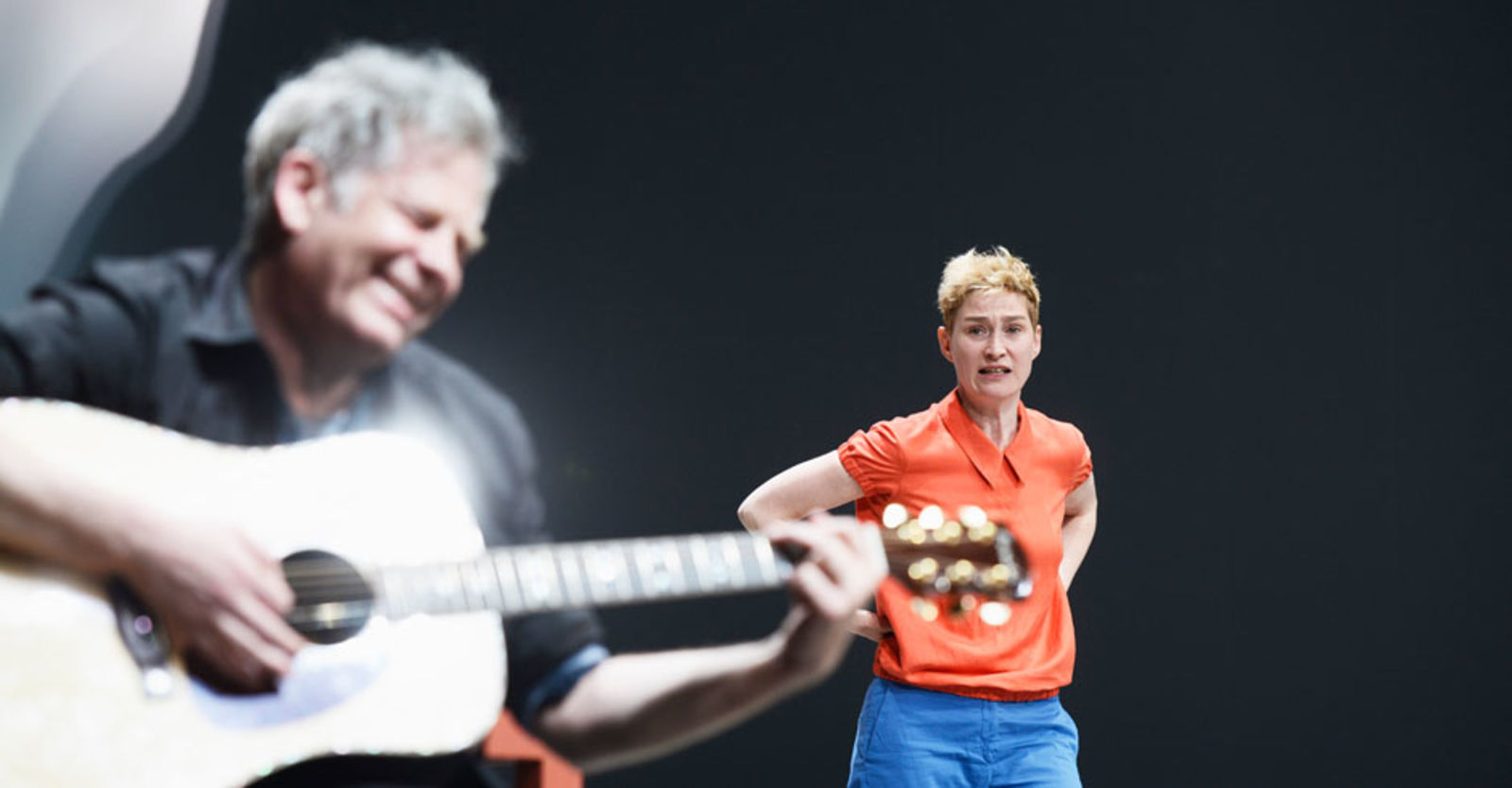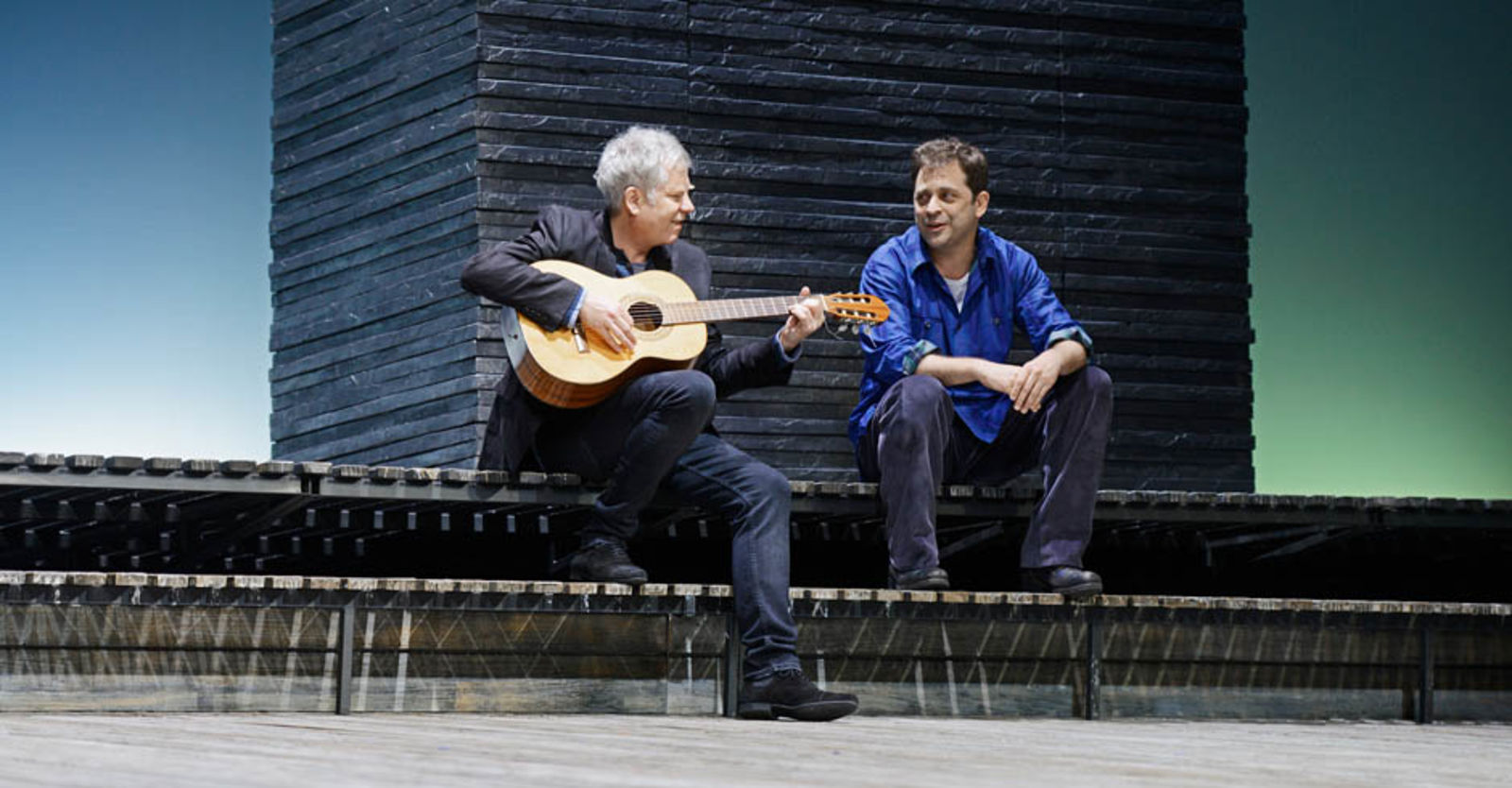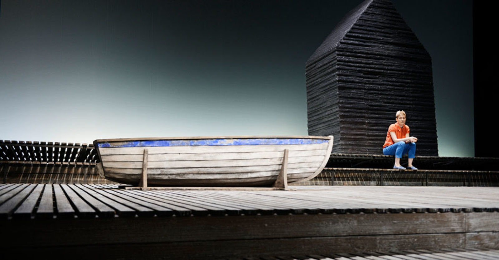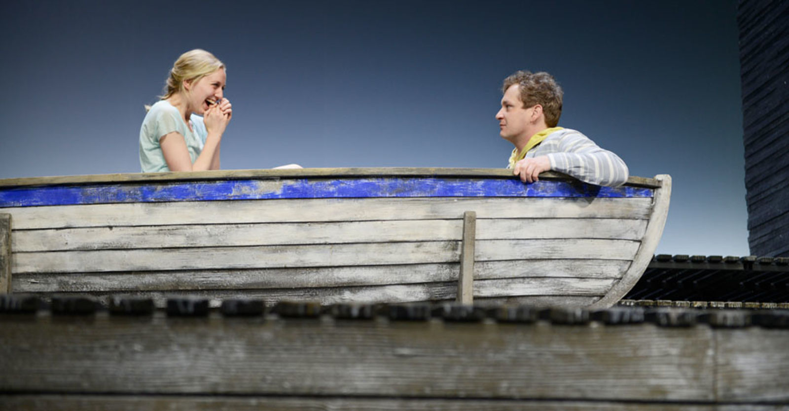 „Die Frau (Yvon Jansen) interessiert sich für Leif (Nicolas Rosat), den Jugendfreund des Mannes (Tilo Nest). Die beiden Jungen gründeten gemeinsam eine Dorfrockband; das „Schöne“, das sie verband, war wohl die Musik – und eine geheimnisumwitterte Bootsfahrt vor Jahren. Nun sehen sie sich wieder: Einen unendlichen Augenblick lang umarmen sie sich; es ist ein Augenblick der Utopie. Nicolas Rosats Leif bleibt fortan ungeschützt, vorbehaltlos offen für die grosse Liebe; Tilo Nest rettet sich in plaudernde Verbindlichkeit. Die Frau – die verzweifelt muntere Yvon Jansen – will in ihr Geheimnis dringen, sie prallt an Rosats solitärem Ernst bloss ab mit all ihren gutgelaunten Vorstössen. Werner Düggelin sieht sie alle mit unerbittlicher Klarheit. Raimund Bauer hat ihm einen sich in heller Ferne verlierenden Holzplankenstrand auf die Bühne gebaut, einen leuchtend leeren Horizont für dieses Spiel der ewigen Lebensunmöglichkeiten. In Düggelins reduzierter, transluzenter Erzählung verliert es alles Kunsthandwerkliche und entwickelt maximale Intensität. Der Mann, Tilo Nest, der sich einzig und allein in der Musik noch findet, in seinem unerträglichen Gitarrengeklimper und diesem Gesang, der die brüchige Schönheit des Irreparablen hat, die Stimme war mal frisch, jetzt ist sie weg. Yvon Jansen mit ihren nervösen Entdeckungsgängen, einen Song lang erkennt sie im Mann den langhaarigen Rocker, in den sie sich einst verliebt hatte, und kreischt wie damals. Nikola Weisse mit einem grossen kleinen Auftritt als wissende Mutter – und allen voran Nicolas Rosat, der andere Mann, Leif, für den die grossen Gefühle eine ganz und gar unzynische wirkliche Grösse haben. Sie erspielen sich tragische Dimensionen, die weit über das Fosse-übliche Nebelgewaber hinausgehen.“ Nachtkritik.de