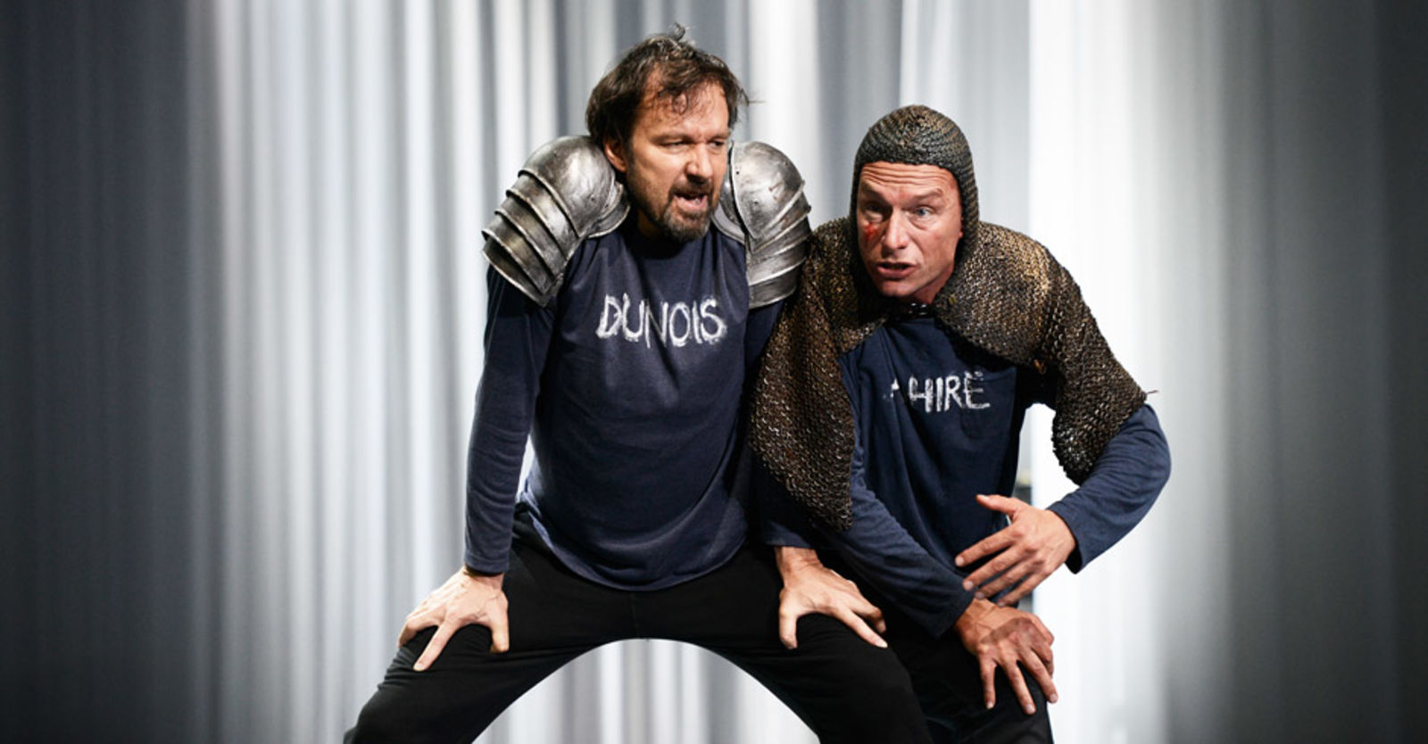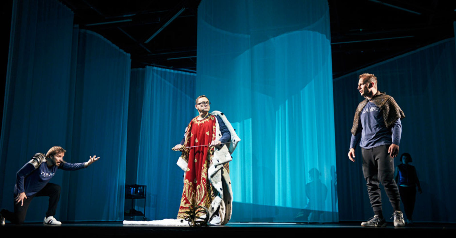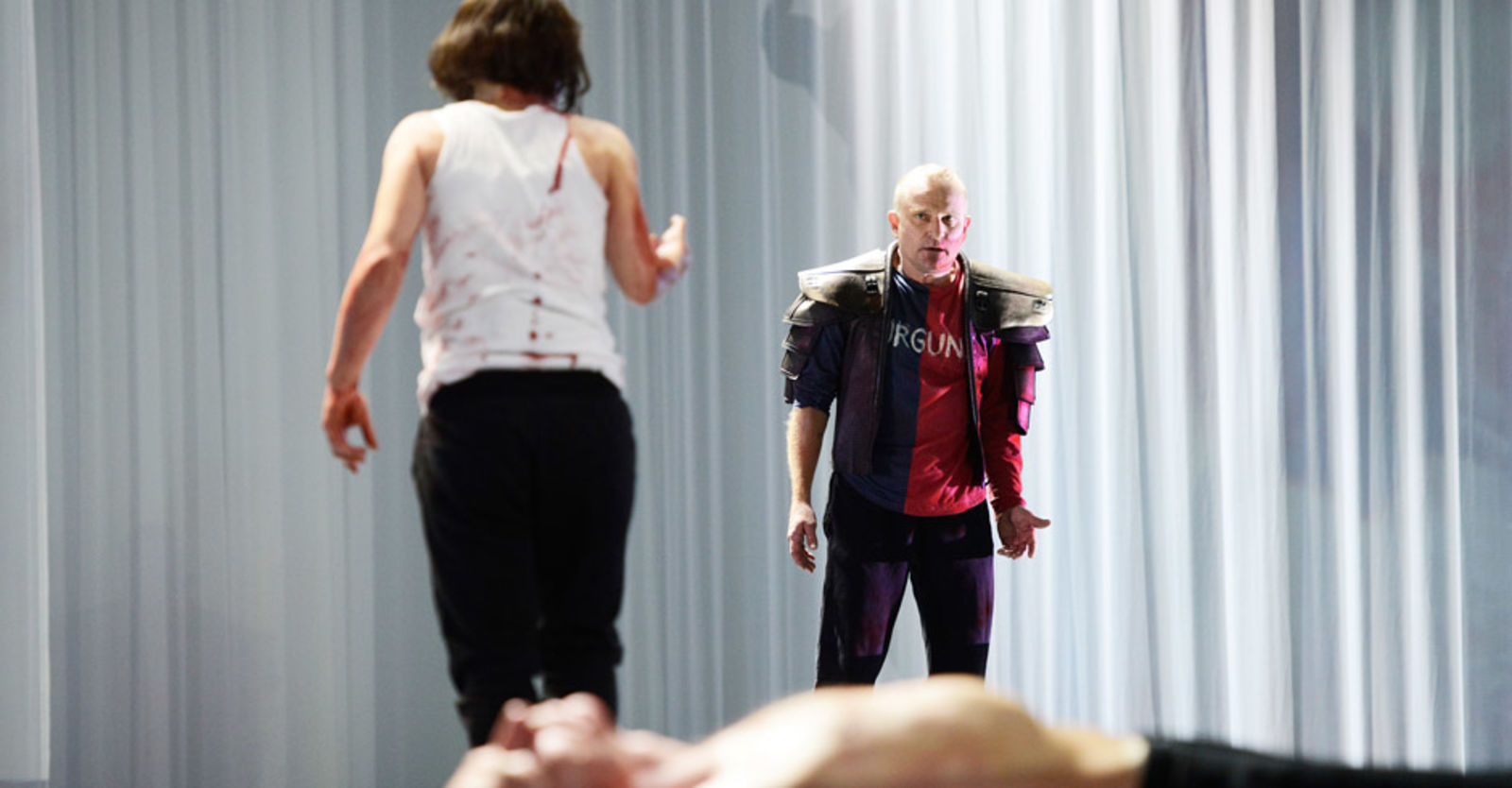 „Die patriarchalen Gebilde sind also zeitlos, ebenso wie der weisse, aseptische Raum von Bühnenbildnerin Katja Hass: Diese „Jungfrau“ spielt in einem Labor für Versuche zu Überlebensstrategien in Zeiten ohne Sinn und Ziel. Sie sind Labormäuse, die Kämpfer hier in der Freizeitfight-Uniform: Jogginghose, Sweatshirt, Turnschuhe. Blau ist die Farbe der Franzosen, Rot die der Engländer (Kostüme: Johanna Pfau), aber eigentlich sind sie alle austauschbar. Daher musste man sie auch anschreiben: Auf jedem Oberteil prangt der Name, und man denkt an Wolf Biermanns „Soldaten sehn sich alle gleich, lebendig und als Leich“. Tages-Anzeiger