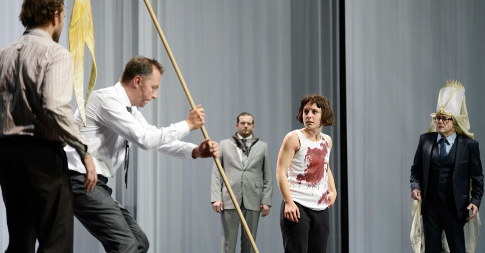 „Vor Schillers „Jungfrau von Orleans“ strecken selbst gestandene Germanisten die Waffen – angesichts der Tatsache, dass man diesem Stück Weimarer Klassik so ohne weiteres nicht beikommen kann. Auch nicht mit Rückgriff auf die Psychologie seit Sigmund Freud oder den Idealismus des Verfassers. Aber für das Theater sind die Schwierigkeiten des Stoffs kein Grund, sich diesem Brocken zu verweigern, der sich selbst eine „romantische Tragödie“ nennt. Zumindest nicht am Schauspielhaus Zürich, wo der alte Schiller nun in der Regie von Stephan Kimmig gezeigt wird – mit Zusätzen von Peter Stamm, der dem Klassiker einen Bezug zur Gegenwart geben will. Angesichts des religiös motivierten Terrorismus unserer Tage zäumt Stamms Zugabe die „Jungfrau“ naheliegenderweise beim Fanatismus auf, den man Schillers Johanna attestieren kann. Angeleitet von Stamms Text, schälen sich auf der Pfauenbühne Vertreter einer Versicherung aus einem Labyrinth aus transparenten Vorhängen heraus, um uns zu verkünden, dass im Terrorismus ein „noch viel zu wenig bearbeitetes Marktsegment“ zu erkennen sei. Dafür müsse man aber „ein Bewusstsein für die Bedrohung in der Bevölkerung“ schaffen, möge das Risiko für einen terroristischen Anschlag in der Schweiz noch so gering sein.“ Nachtkritik.de