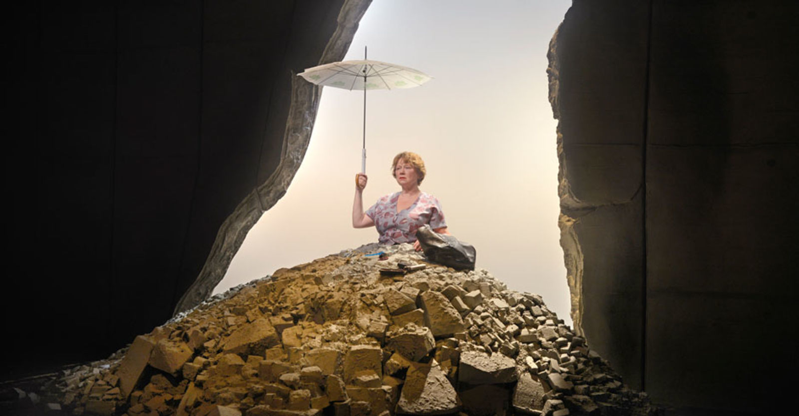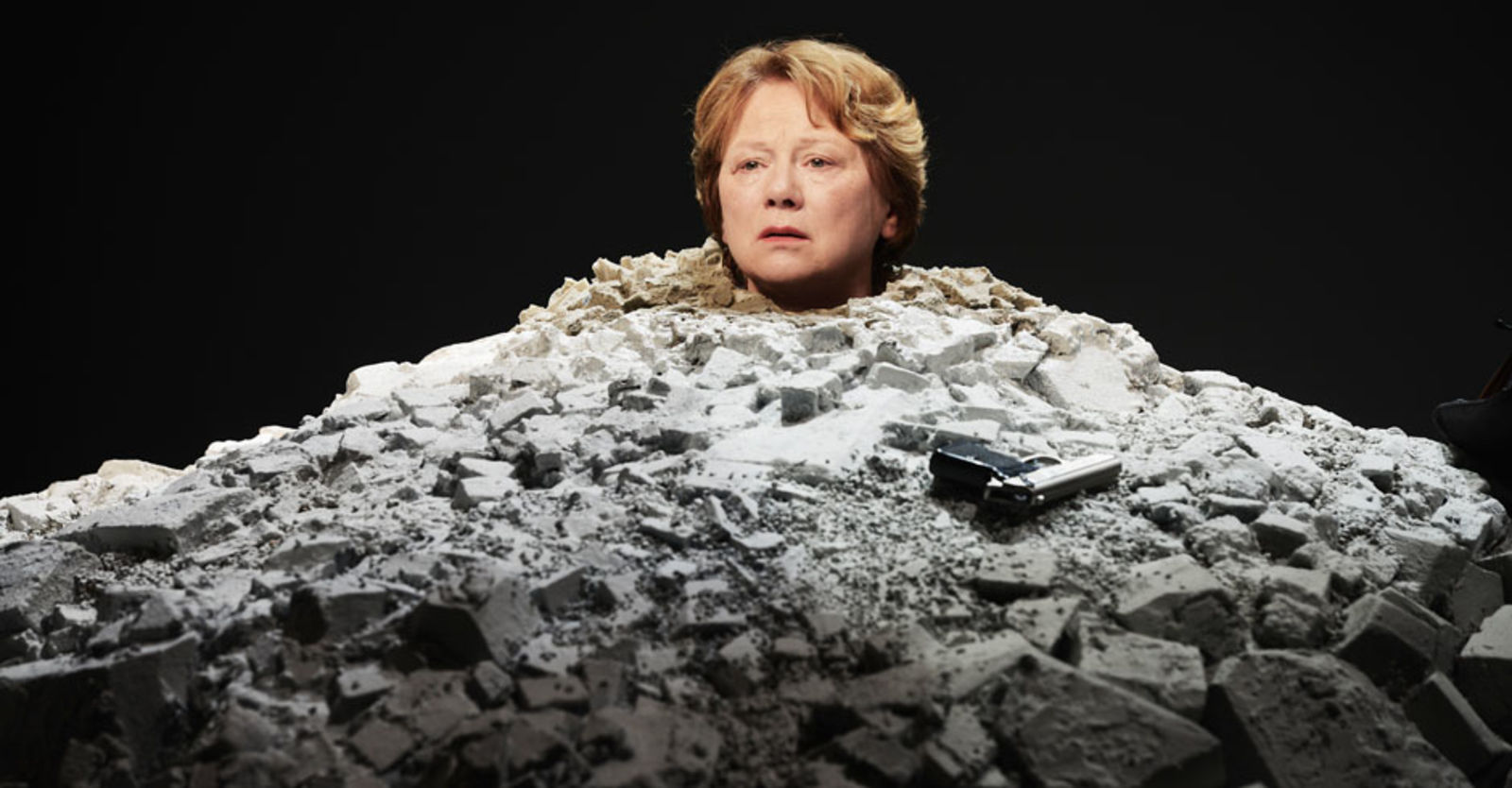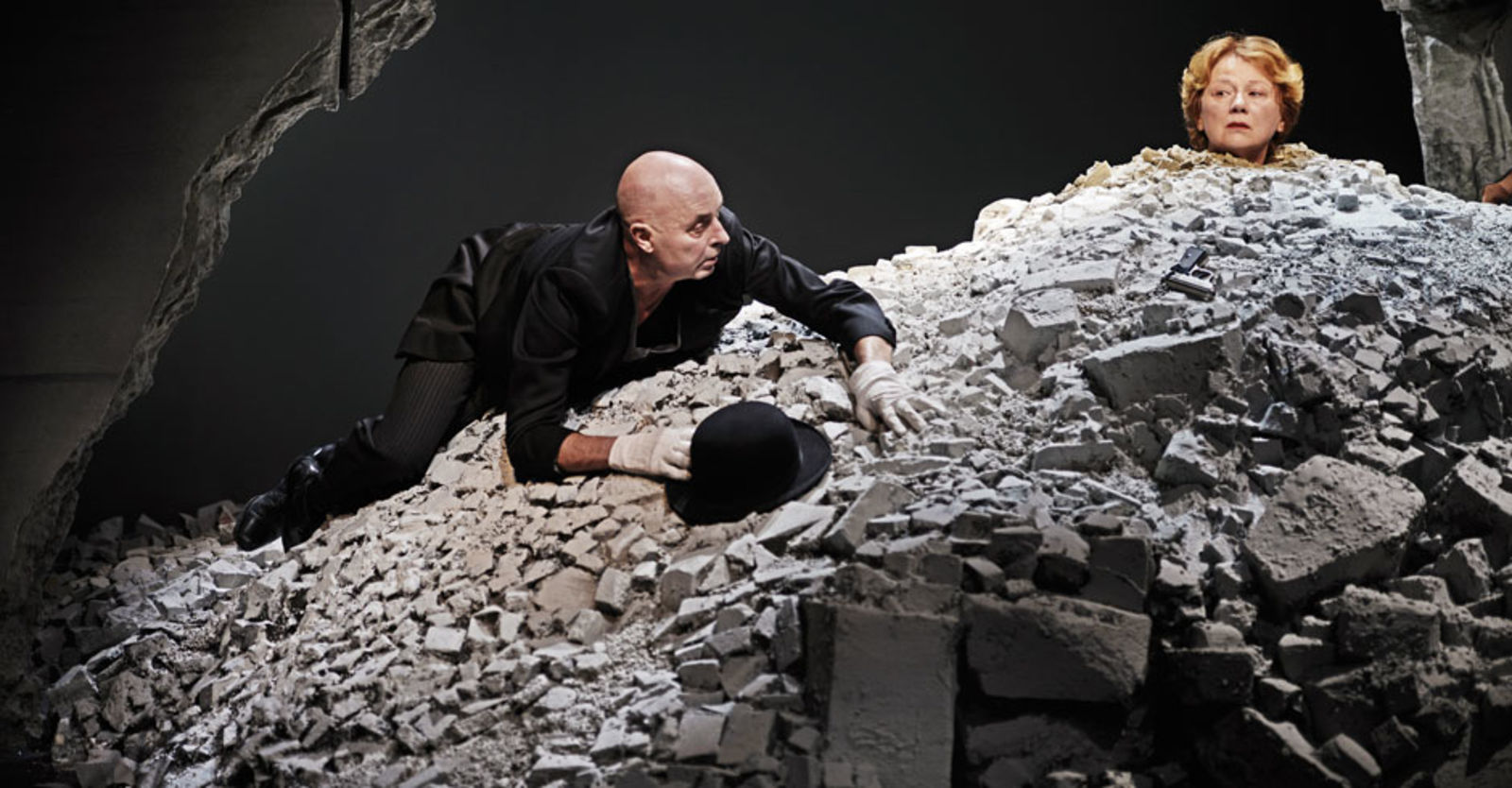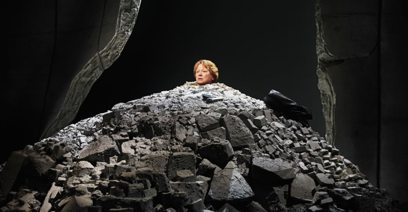 Winnie, die Frau, steckt bis zur Brust in einem Erdhaufen und droht tiefer und tiefer darin zu versinken. Sie hält an alltäglichen Tätigkeiten fest, die einst einen Sinn gehabt haben mögen, aber angesichts der völligen Auflösung von Winnie nur mehr die Funktion haben, sich die Zeit zu vertreiben. Ihr Mann Willie ist zum wortkargen schläfrigen Vierbeiner verkommen, der sich nur noch kriechend fortbewegen kann. Plötzlich wird er von einem Funken Erotik durchglüht und versucht, den Erdhaufen, der die Frau langsam verschlingt, zu besteigen. Im krassen Widerspruch zur äusserlich katastrophalen Situation erscheint die Frau doch als Inbegriff eines glücklichen Menschen, da sie sich über unscheinbarste Ereignisse freut und ihr Schicksal mit unbeirrbarem Optimismus belächelt. Wie die Personen in anderen Stücken von Samuel Beckett bestehen auch Winnie und Willie auf der Illusion des Wartens auf etwas nie Eintreffendes und überspielen in tragikomischer Hilflosigkeit ihren eigenen Verfall. Das 1961 in New York uraufgeführte Stück ist einer der visionärsten Theatertexte des 20. Jahrhunderts. Werner Düggelin, 1929 in Siebnen im Kanton Schwyz geboren, verbindet eine langjährige, intensive Beschäftigung mit Beckett. Düggelin lernte in den Fünfzigerjahren in Paris das Regiehandwerk, wo er Samuel Beckett persönlich kennenlernte. Er war massgeblich daran beteiligt, dass es 1954 zur Schweizerischen Erstaufführung von „Warten auf Godot“ in der Regie von Roger Blin kam. Ausserdem war er einer der ersten deutschsprachigen Regisseure, der Stücke von Samuel Beckett, Eugène Ionesco, Georges Schehadé, Albert Camus, Jean Genet und Paul Claudel in deutscher Sprache inszenierte. Werner Düggelin prägte von 1968 bis 1975 als Schauspieldirektor des Theater Basel die Schweizer Theaterlandschaft. Seitdem arbeitet er als freier Regisseur. 1995 erhielt er den Kulturpreis der Stadt Basel und im Juni 2014 den Kunstpreis der Stadt Zürich. Zuletzt waren am Schauspielhaus Zürich in seiner Regie Jon Fosses „Schönes“ und Molières „Der Bürger als Edelmann“ zu sehen.