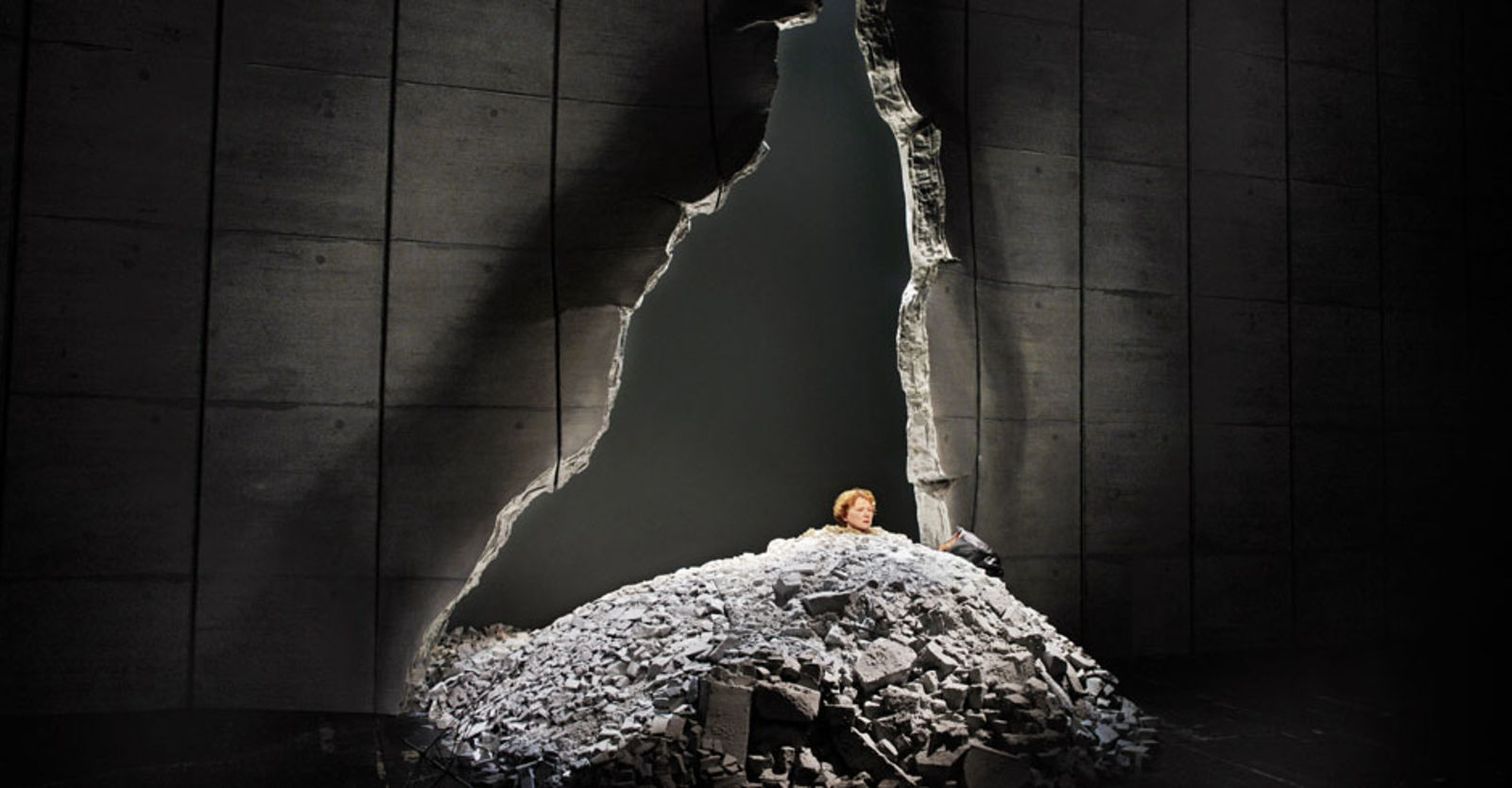 „Altmeister Werner Düggelin (86), der sich schon einmal in den Ruhestand verabschiedet hatte, kann die Regiearbeit nicht lassen. In der Schiffbau-Box des Zürcher Schauspielhauses zeigt er eine streng choreografierte, jedoch vergnüglich-entspannte Inszenierung vom unausweichlichen Ende von Winnie und Willie. Grau in Grau ist die Bühne gestaltet, Winnie steckt in einem Schutthaufen, herausgebrochen aus der dahinter stehenden Betonwand (Bühnenbild: Raimund Bauer).“ seniorweb.ch