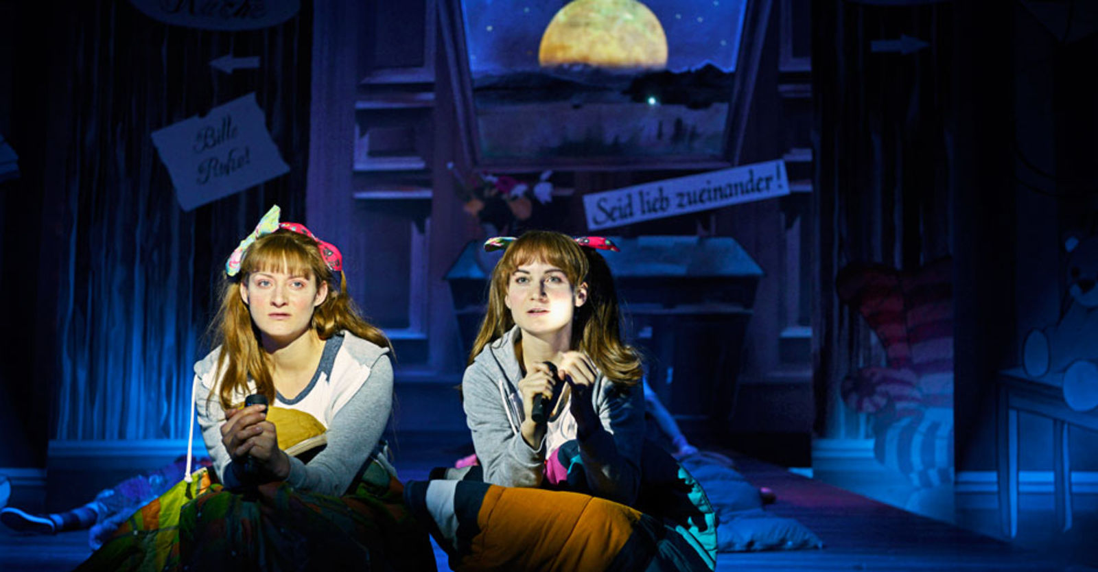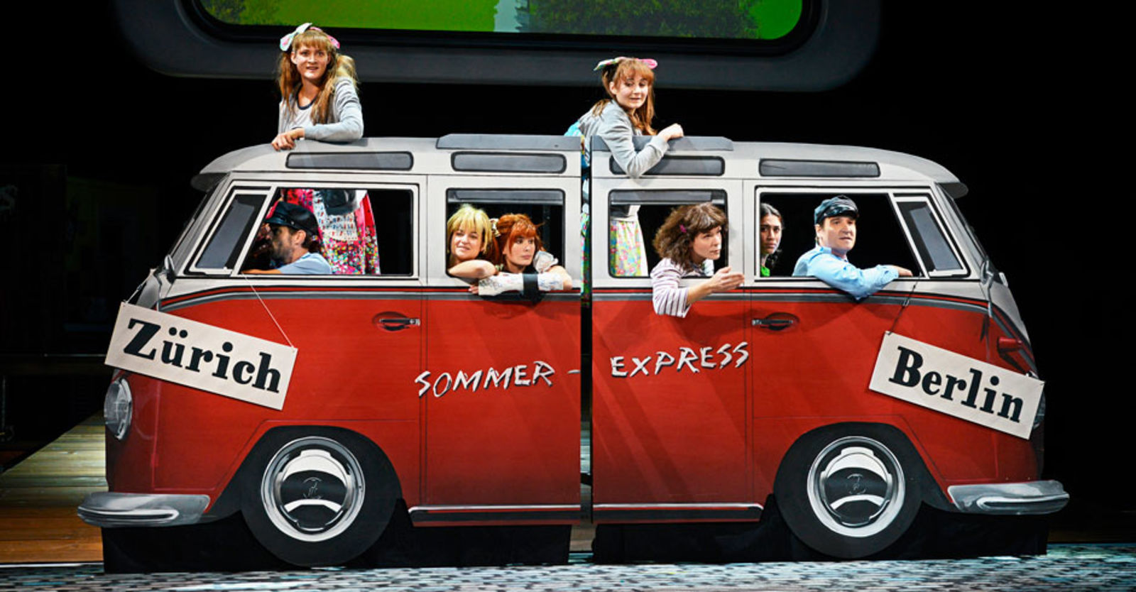 „Das Stück beginnt im Ferienheim Seebühl am Bühlsee. Da treffen sich die gleich aussehenden Mädchen und finden heraus, dass sie nach der Scheidung der Eltern getrennte Zwillinge sind, die nun bei der Mutter beziehungsweise beim Vater leben. Sie hecken einen Plan aus: Nach den Ferien fahren sie zum anderen Elternteil: Lotte zum Vater nach Berlin, Luise zur Mutter nach Zürich. Dann wechselt das Geschehen hin und her zwischen den Schauplätzen in Berlin und Zürich. Die Schwestern Rast haben dafür eine elegante Lösung gefunden: zweidimensionale Elemente, die auf die Bühne geschoben werden. So weicht die Berliner Currywurst-Bude der Zürcher Metzgerei Horni. Auch die Fahrzeuge sind zweidimensional, werden mit Hand und Fuss betrieben, und der Fahrer erzeugt auch selber das Motorengeräusch.“ NZZ