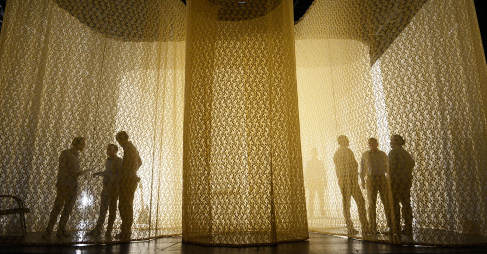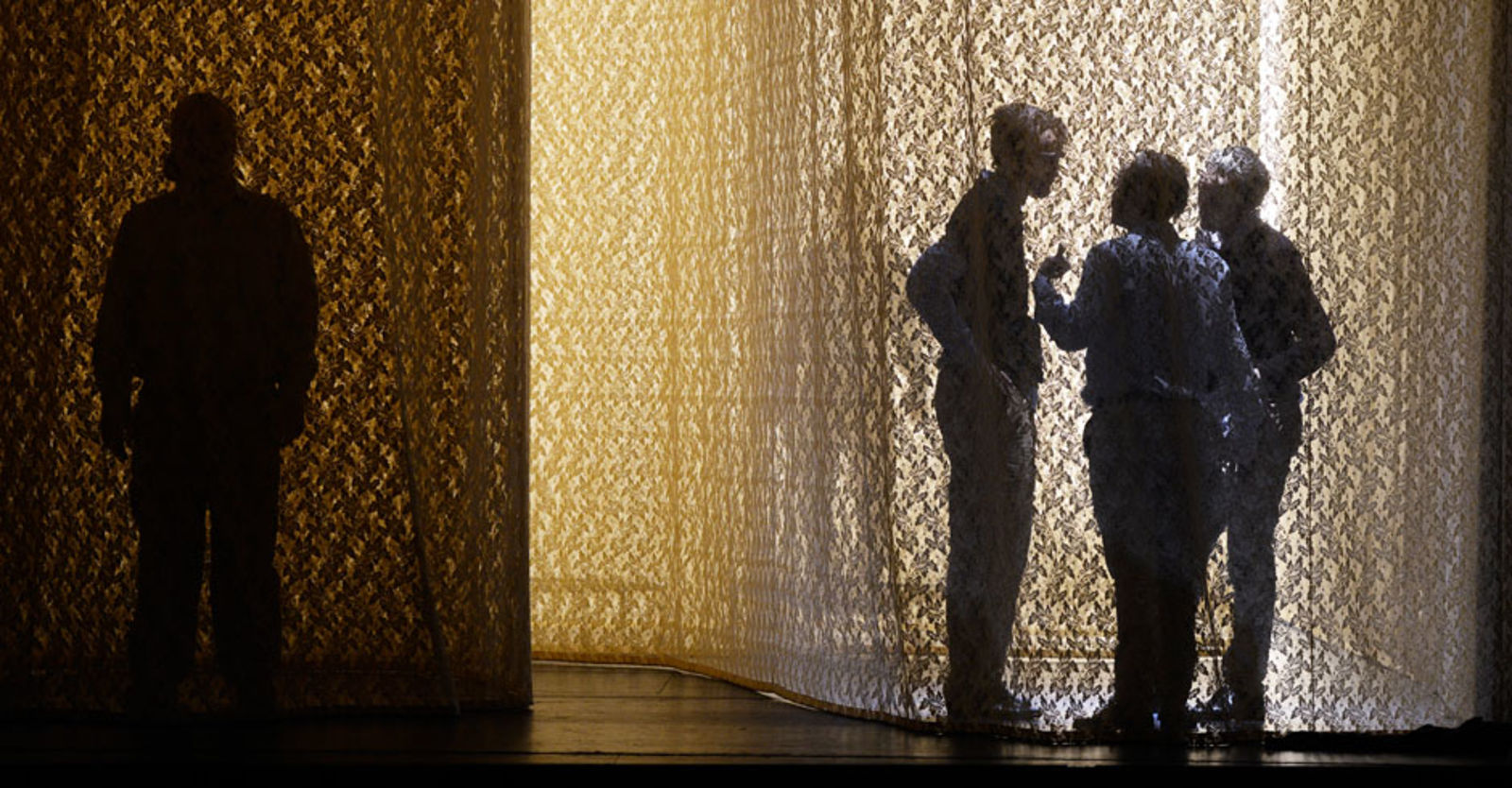 „Die Bühnenbildnerin Eva-Maria Bauer lässt sie zunächst auf der leeren Fläche agieren. Aus einem Spalt im Hintergrund erscheinen und verschwinden phasenweise bühnenhohe weisse Vorhangbahnen, die sich schliesslich in vielen Windungen über die ganze Bühne ziehen.“ Sarganserländer