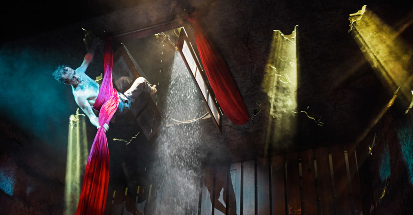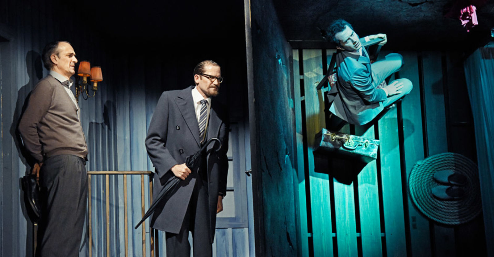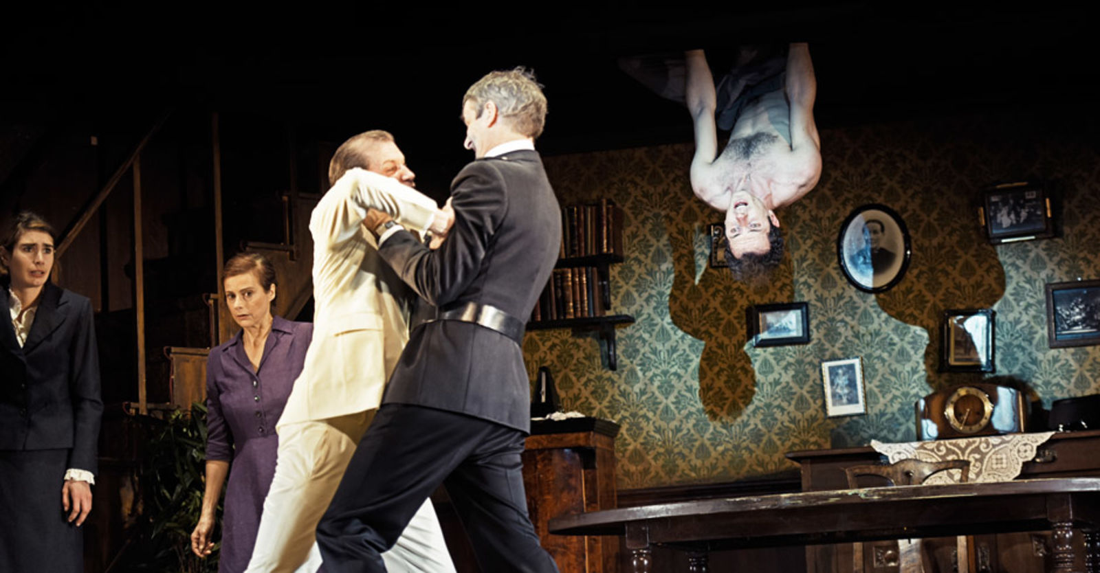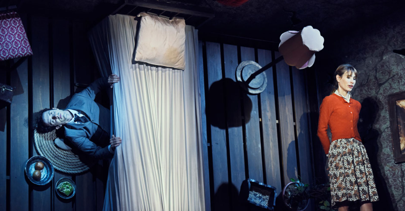 „Wir sollten über das Klettern reden. Denn Gregor Samsa klettert wie wild über die Wände und die Decke seines Schlafzimmers. Er hangelt sich am Treppengeländer hinab ins Wohnzimmer und huscht über Tisch und Anrichte. Der Clou der Inszenierung von Franz Kafkas „Die Verwandlung“ am Zürcher Pfauen ist das Bühnenbild von Börkur Jónsson, der zwei Räume untereinander auf die Bühne hat bauen lassen: Unten das Wohnzimmer der Familie Samsa, oben Gregor Samsas Schlafzimmer.