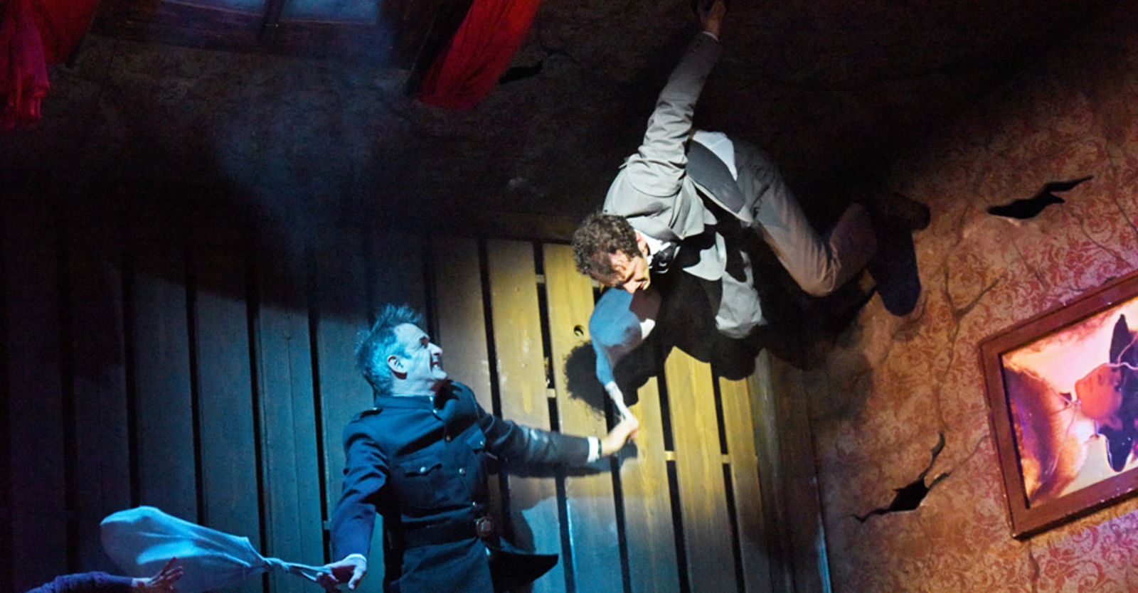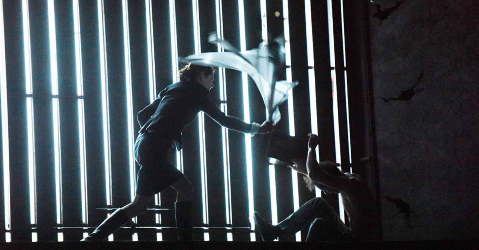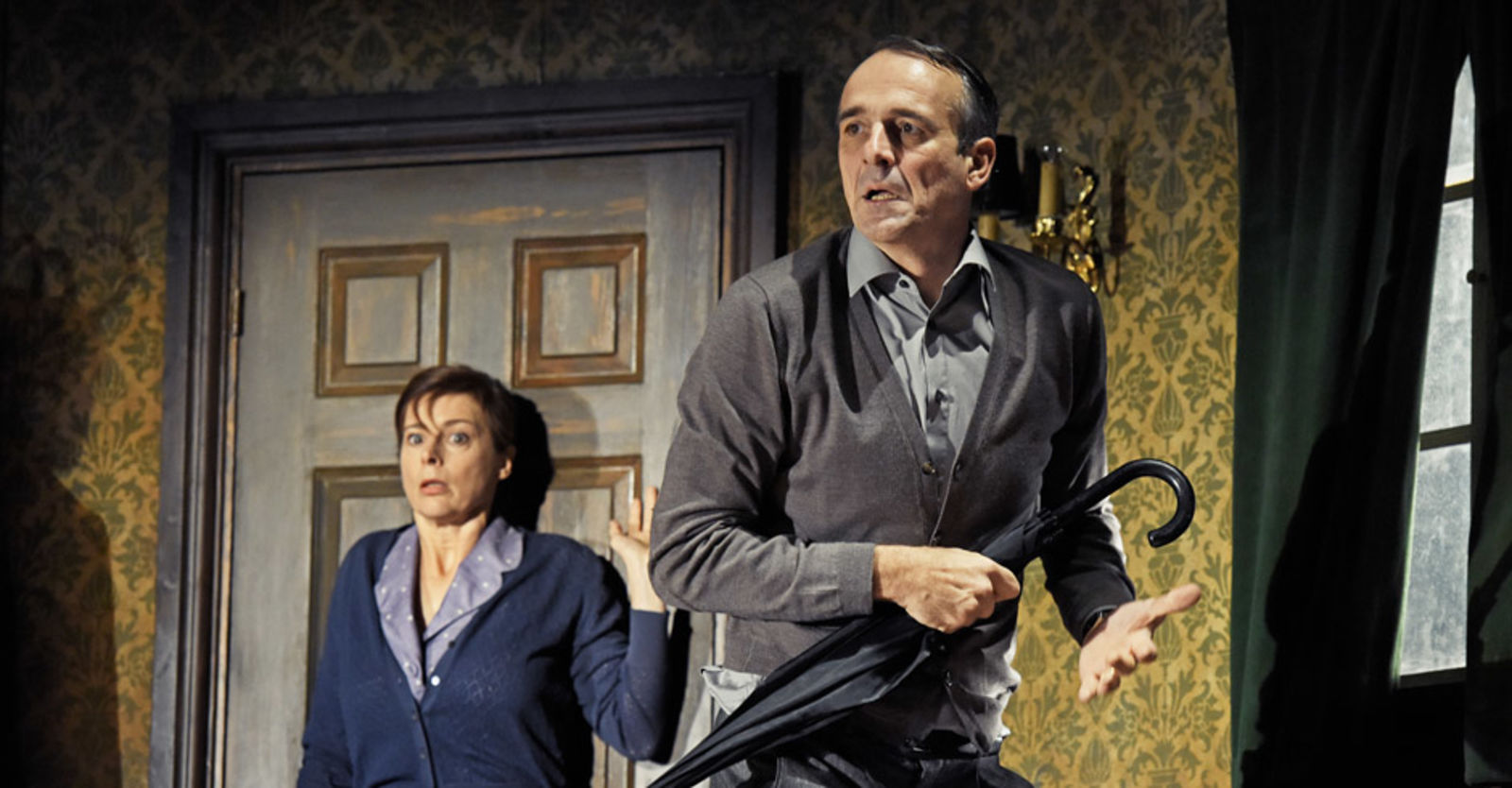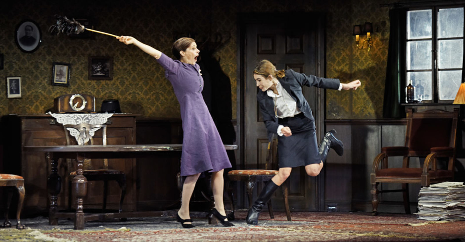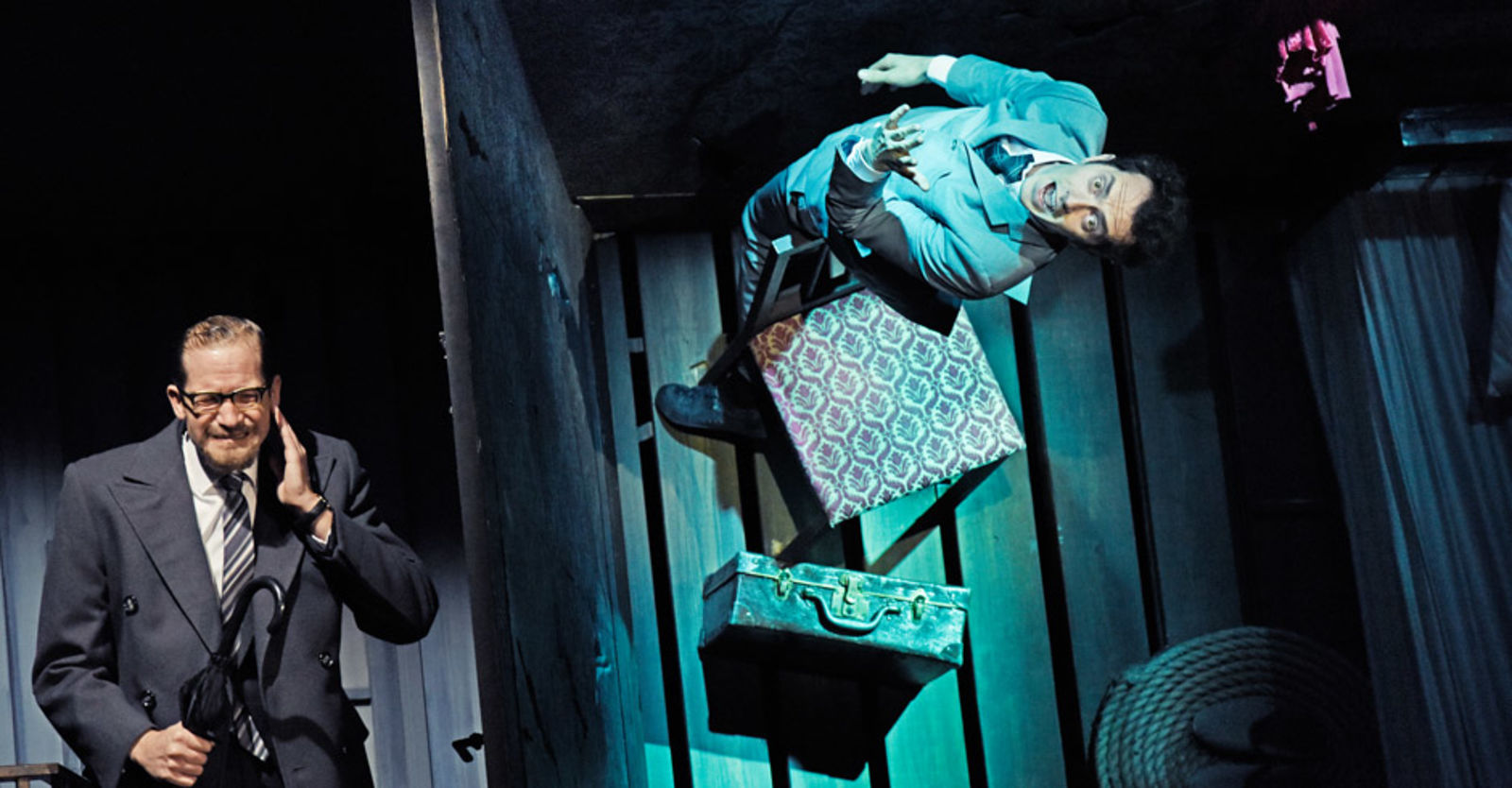 „Wir sollten über das Klettern reden. Denn Gregor Samsa klettert wie wild über die Wände und die Decke seines Schlafzimmers. Er hangelt sich am Treppengeländer hinab ins Wohnzimmer und huscht über Tisch und Anrichte. Der Clou der Inszenierung von Franz Kafkas „Die Verwandlung“ am Zürcher Pfauen ist das Bühnenbild von Börkur Jónsson, der zwei Räume untereinander auf die Bühne hat bauen lassen: Unten das Wohnzimmer der Familie Samsa, oben Gregor Samsas Schlafzimmer.