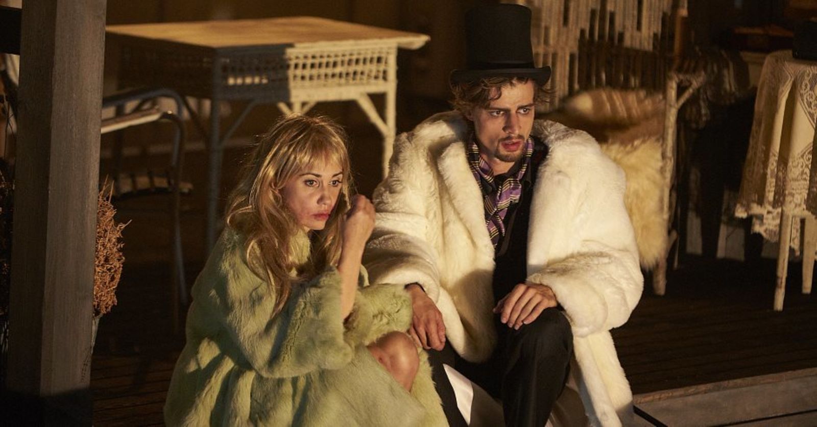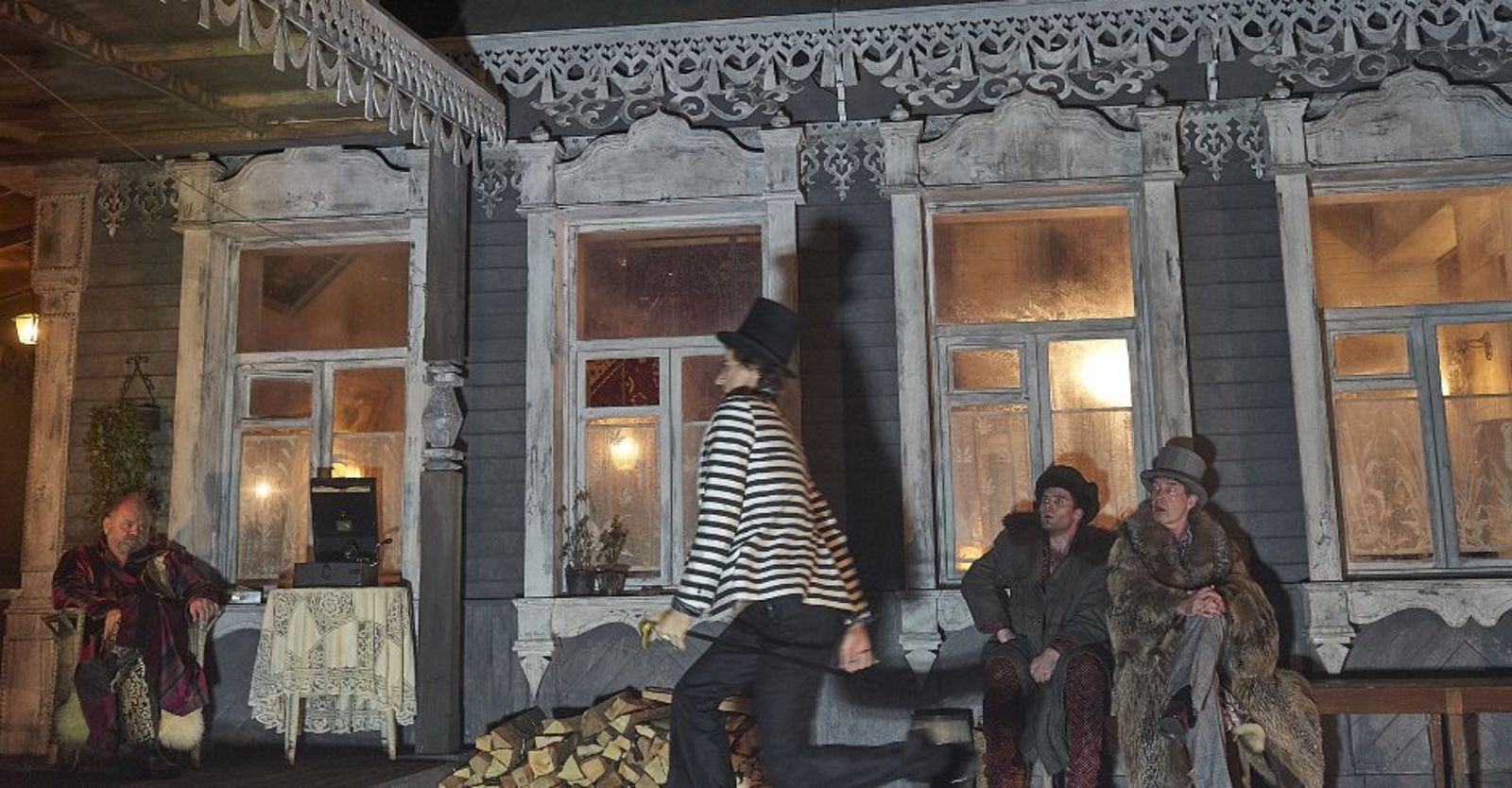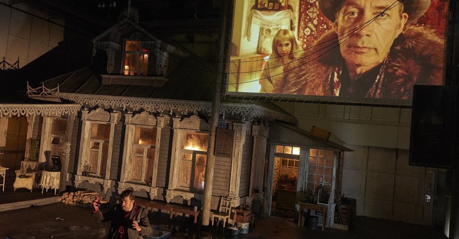 Diese beiden Ebenen sind schön ineinander geblendet, und Castorf inszeniert das in einem muffigen, sehr russischen Bühnenbild von Aleksandar Denic, in einem heruntergekommenen Gasthof aus dem 19. Jahrhundert mit Dachkammer. Wie üblich mit Live-Kamera in den Innenräumen, anfangs eher hysterisch, mit zunehmender Spieldauer aber immer ernsthafter um die Figuren bemüht, die wie immer ständig die Rollen wechseln.
