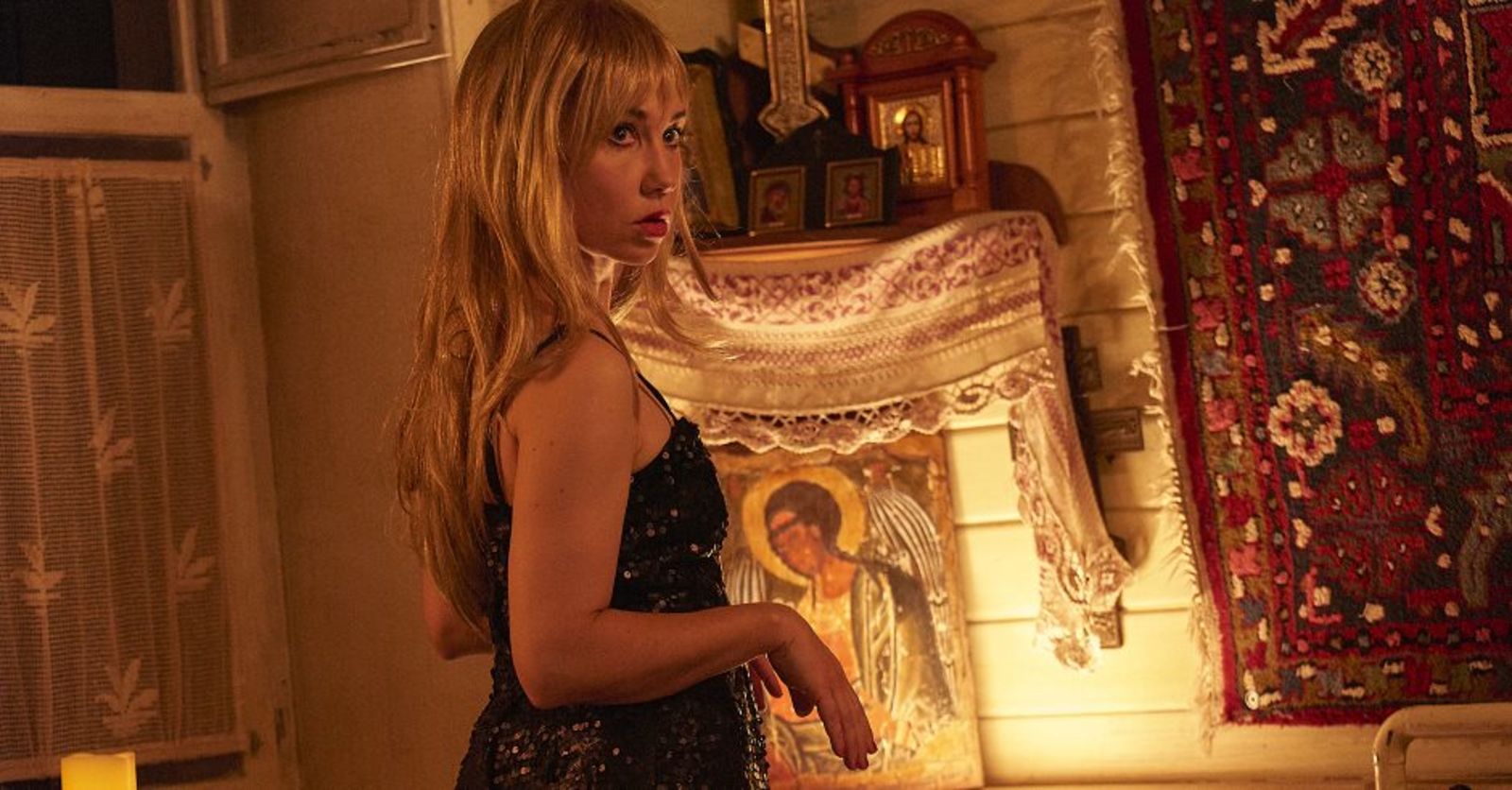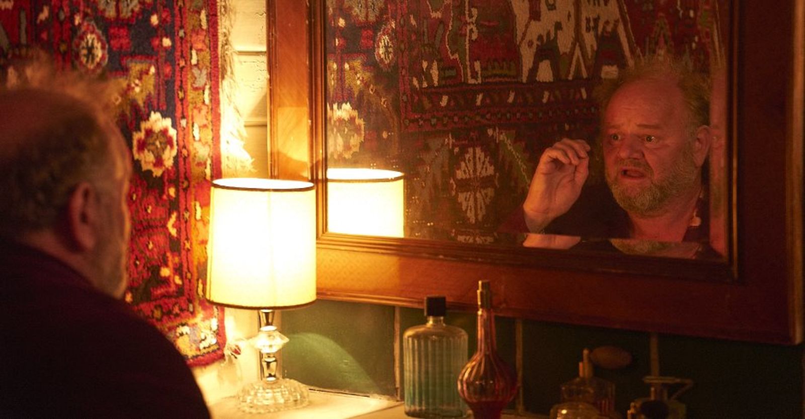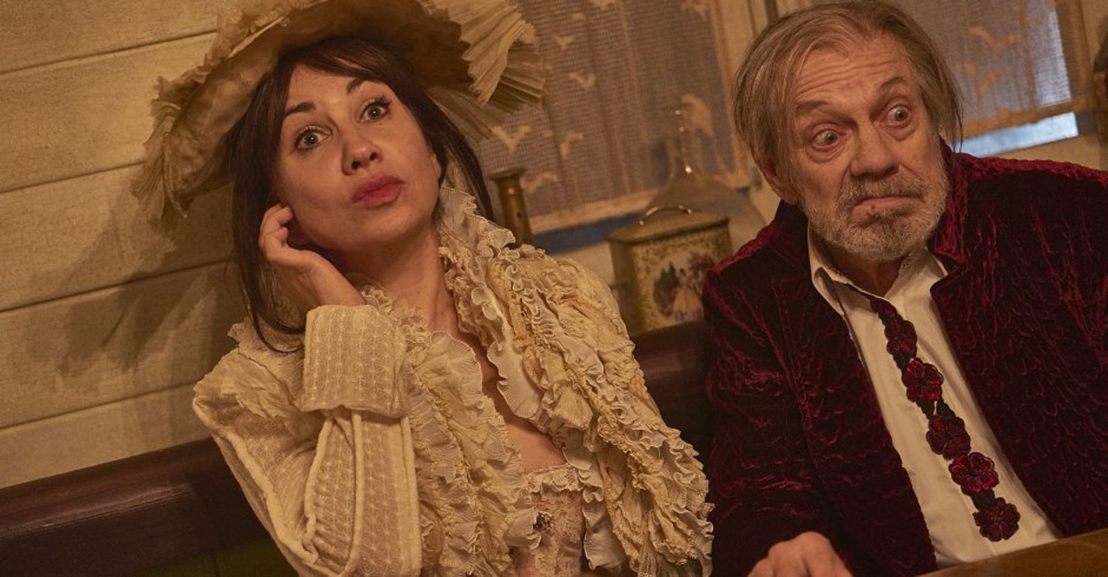 Diese beiden Ebenen sind schön ineinander geblendet, und Castorf inszeniert das in einem muffigen, sehr russischen Bühnenbild von Aleksandar Denic, in einem heruntergekommenen Gasthof aus dem 19. Jahrhundert mit Dachkammer. Wie üblich mit Live-Kamera in den Innenräumen, anfangs eher hysterisch, mit zunehmender Spieldauer aber immer ernsthafter um die Figuren bemüht, die wie immer ständig die Rollen wechseln.