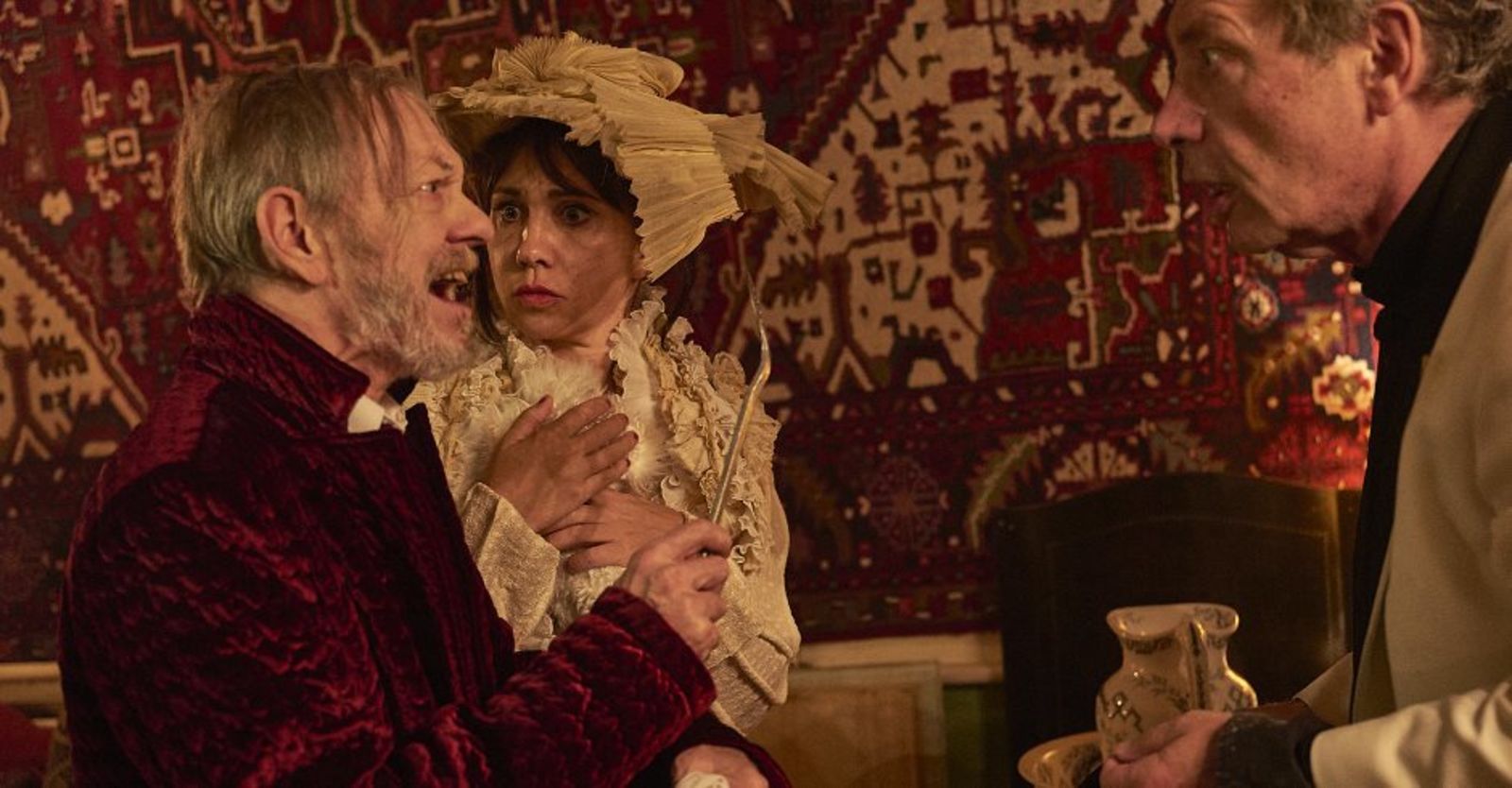 Ob sie als kleines Mädchen mit einem Stock und einem Stück Kreide bewaffnet in den Krieg zieht gegen Polen, Amerika, Russland und Deutschland, ob sie mit der absurden Geschichte eines Schlittenunfalls von ihrem Seitensprung ablenken möchte. Oder ob sie würdevoll, aber mit geballter Verachtung hinabschaut auf ihren greisen, erbärmlich hustenden Gatten (Siggi Schwientek) – sie steht immer im Zentrum. Die Wolga ergreift auch Hiesige, macht aus Robert Hunger-Bühler einen wütenden, wahnsinnigen Ehemann, der in den Strudel der Eifersucht gerät, sich mit dem Liebhaber seiner Frau (Johann Jürgens) um Kopf und Kragen redet, in der Oper einen Theaterzettel abfängt und sich mit Posaune unter dem Bett einer fremden Frau wiederfindet, unter dem schon ein anderer Mann liegt. Am Ende ist der Hund der Frau tot und Robert Hunger-Bühler, der lange nicht mehr so quirlig-quecksilbrig gespielt hat, steht mit ewig-müdem Gesicht vor der eigenen Ehefrau.“ Nachtkritik.de