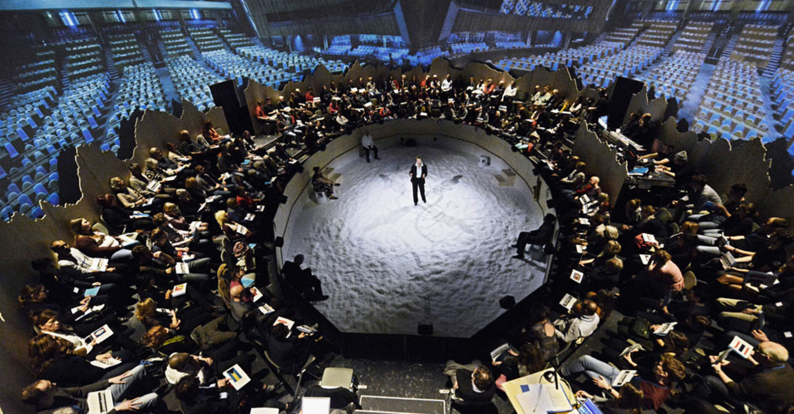 Jedes Jahr treffen sich im Januar über 3000 CEOs, StaatspräsidentInnen, VertreterInnen von NGOs und ManagerInnen von milliardenschweren Fonds im Städtchen Davos, das zu diesem Anlass vom Schweizer Militär bestens bewacht wird. Über 300 programmierte Sessions und unzählige Treffen unter vier Augen bilden das Rückgrat des „World Economic Forums“ (WEF), für das vier Tage lang nahezu jedes Verkaufslokal in Davos seine Auslage räumt, um seine Räumlichkeiten an eine Firma oder eine global agierende Bank zu vermietet. Die Produktion „Weltzustand Davos“ hat die Dokumentartheatergruppe Rimini Protokoll mit Experten und Betroffenen entwickelt, die hier selbst auf der Bühne stehen. Das exklusive World Economic Forum, das sich zum Ziel gesetzt hat, den Zustand der Welt zu verbessern, stellen hingegen die Zuschauer dar, die jeweils in die Rolle eines teilnehmenden Konzernchefs schlüpfen dürfen. Die Produktion vervollständigt die Serie „Staat 1–4“, in welcher Rimini Protokoll in vier Produktionen an unterschiedlichen Theatern Phänomene der Postdemokratie betrachtet.