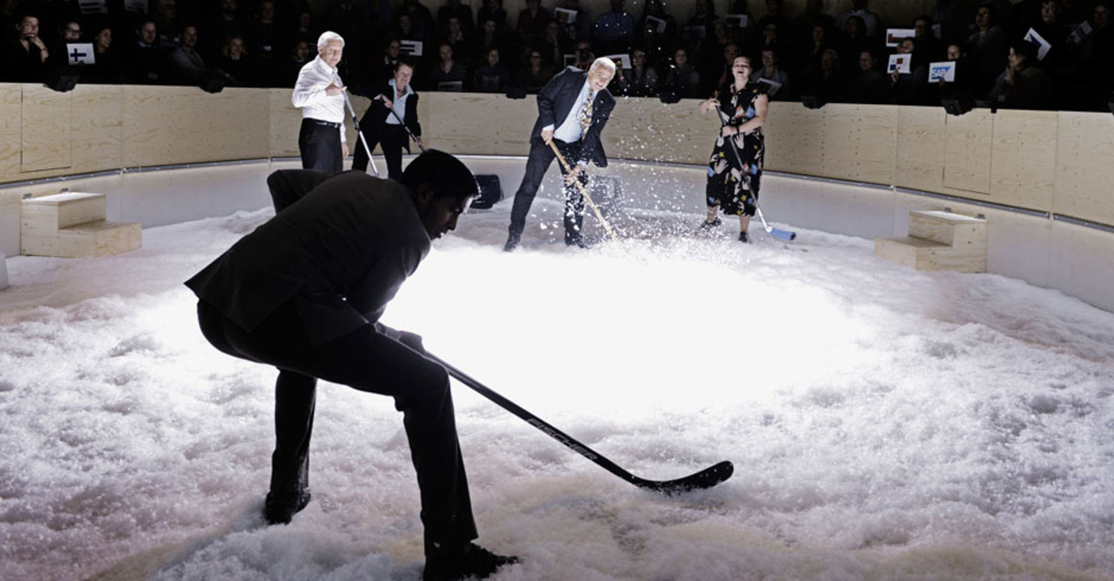 „Die Zuschauer erleben diese Spannung zwischen Politik und Wirtschaft, indem sie nicht nur einen CEO verkörpern, sondern auch die Flagge eines UNO-Mitgliedlandes in ihren Unterlagen haben. Im Schlusshockeyspiel dieses bunten und mitunter witzigen Abends können sie Farbe bekennen: Wer hält seine Firma hoch, wer seinen Staat?“ sda