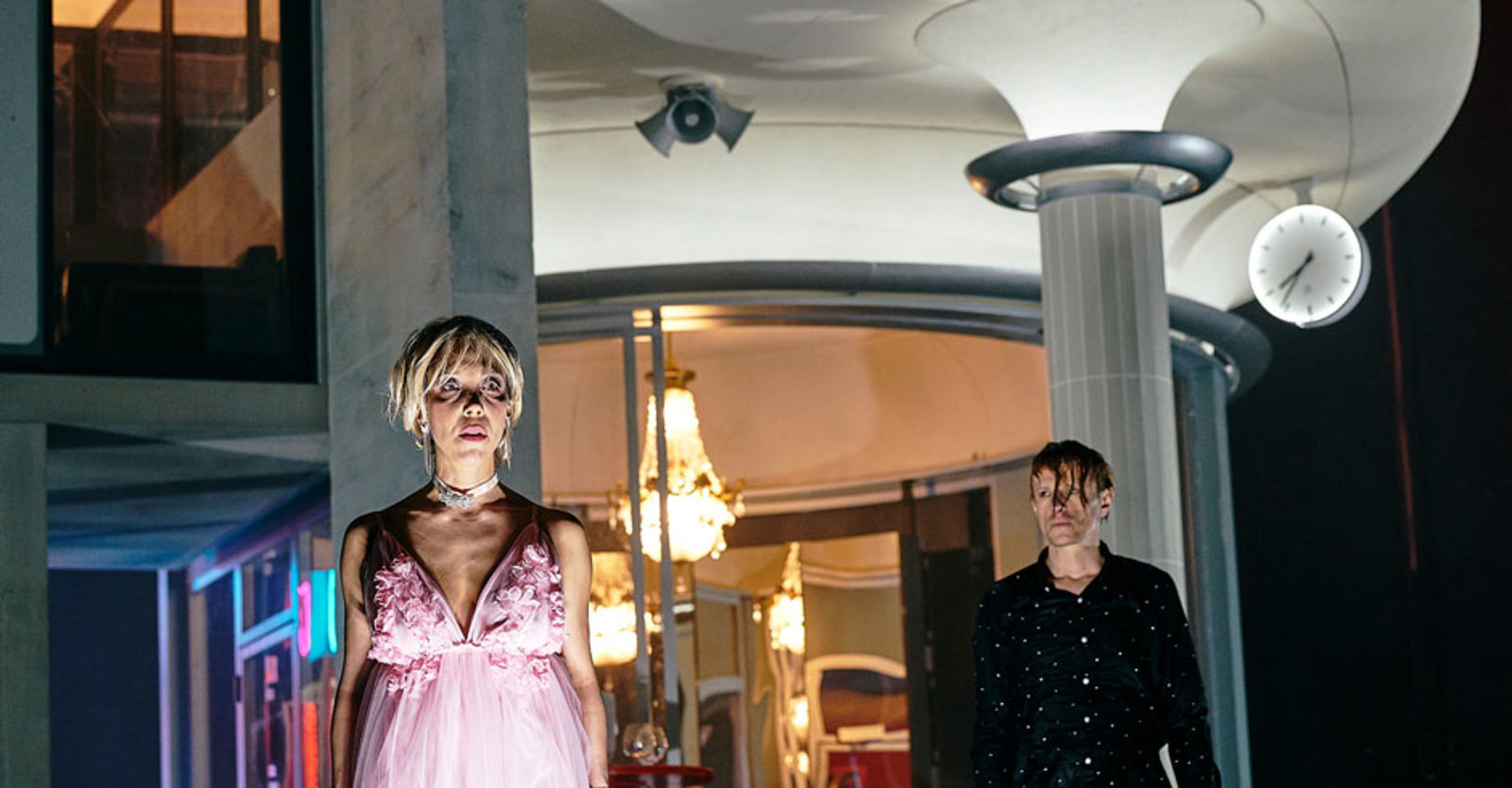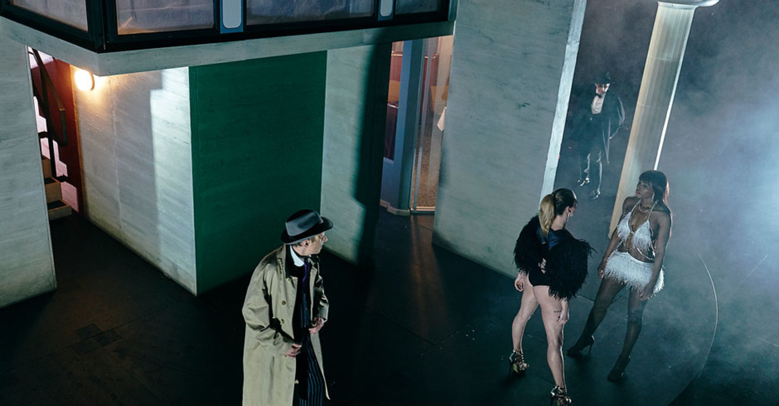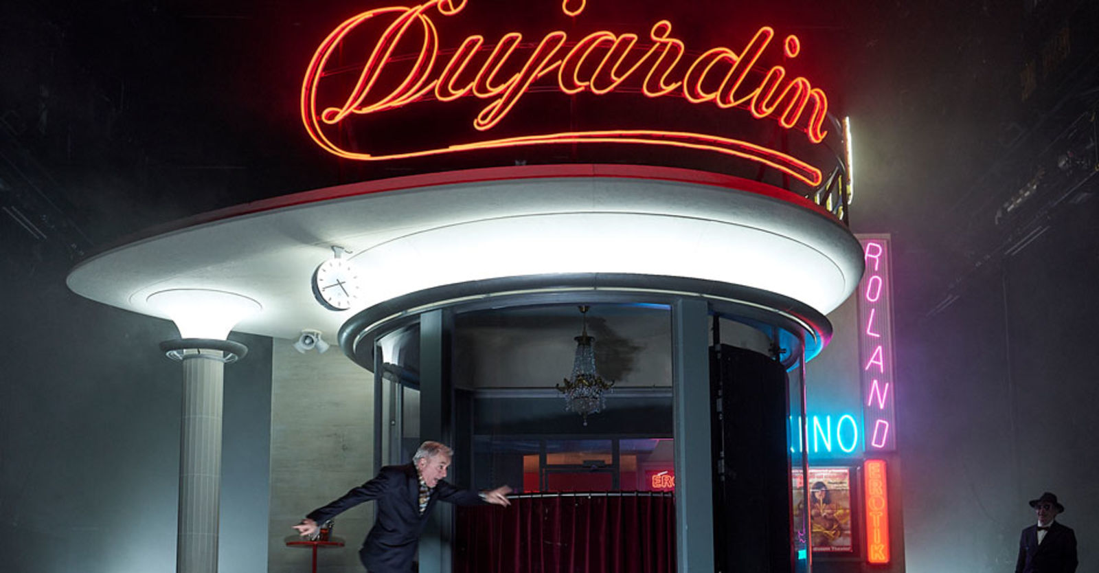 „Drei real existierende Bauten in der Stadt Zürich wurden hier von Aleksandar Denic auf eine Drehscheibe gehoben und zu einem modernistischen Bühnenwunderbauwerk samt Justitia-Skulptur ineinandergeschachtelt: das Corbusier-Haus aus dem Seefeld, das Belcafé der Bellevue-Haltestelle und das Sexkino Roland von der Langstrasse.“ Tages-Anzeiger