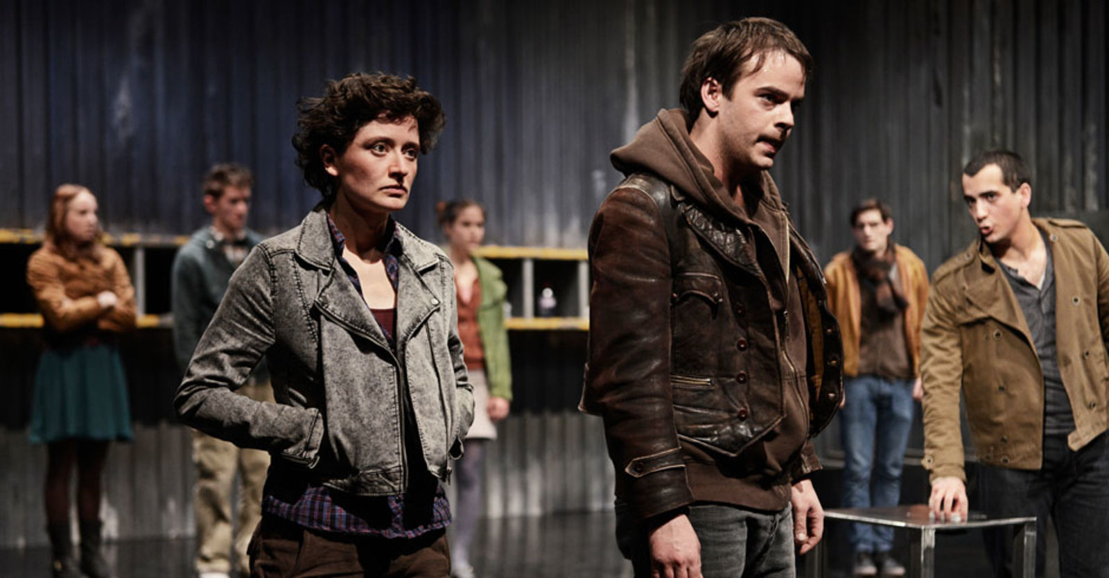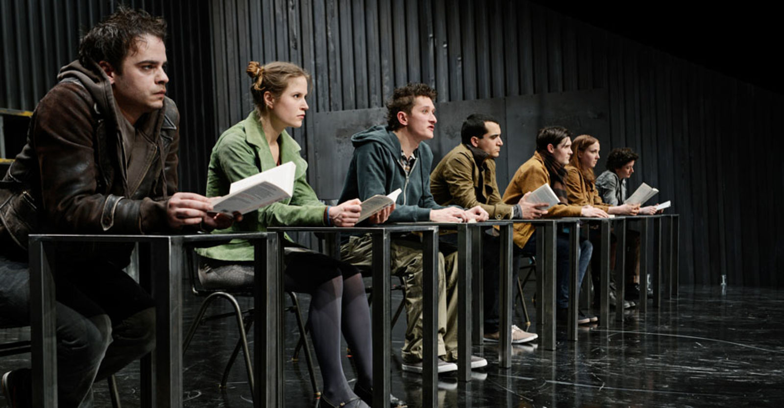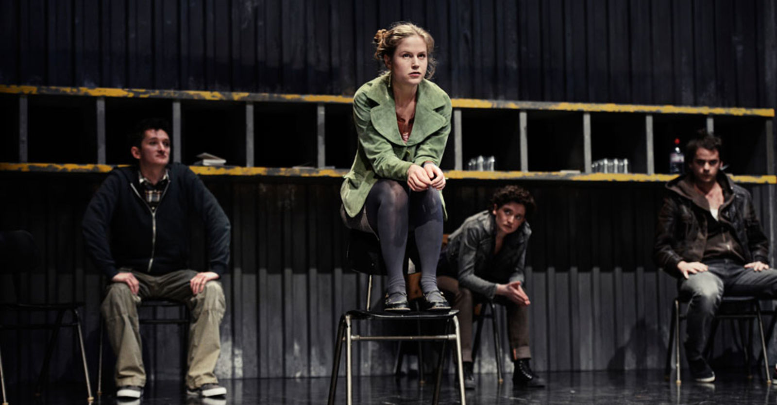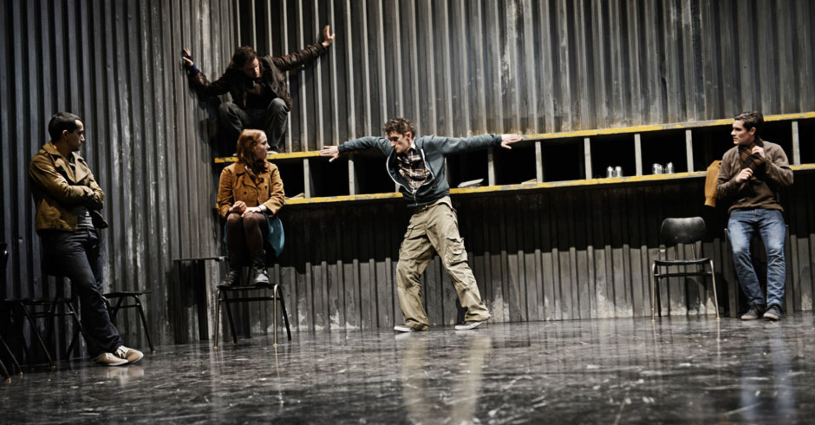 „Das sehr schlicht gehaltene Bühnenbild von Marc Totzke bietet einen stimmigen Rahmen dafür. Die Bühne ist auf drei Seiten von einer sehr hohen Wellblechwand umgeben, auf dem Boden stehen ein paar metallene Tische und an der hinteren Wand ist ein Regal angebracht. Damit wird optisch dargestellt, was die Jugendlichen fühlen: eine kalte Umwelt, deren Konventionen und Erwartungen sie umschliessen.“ kulturkritik.ch