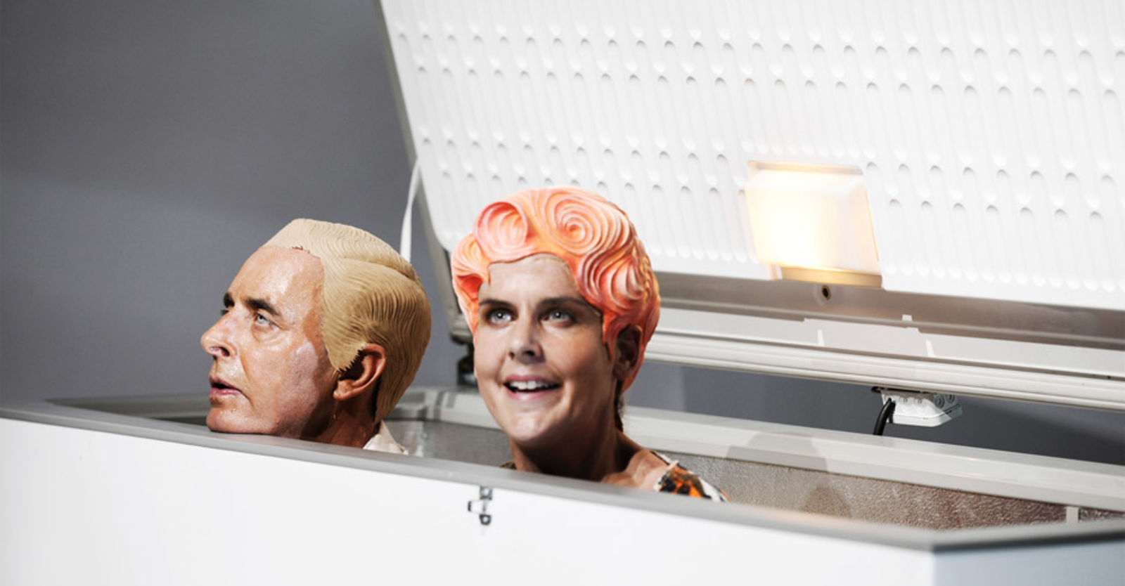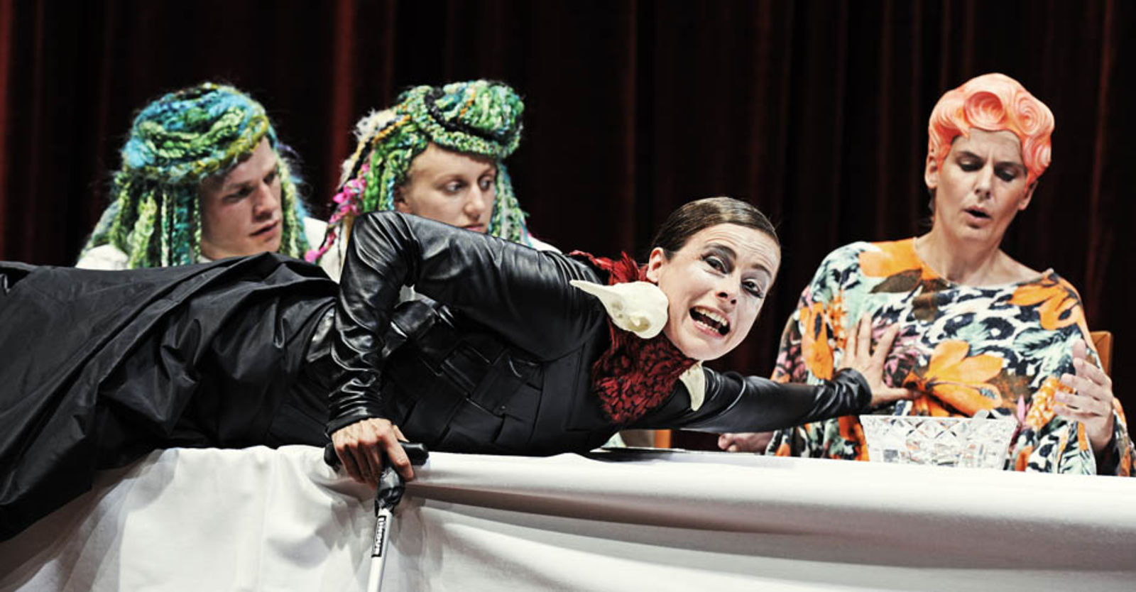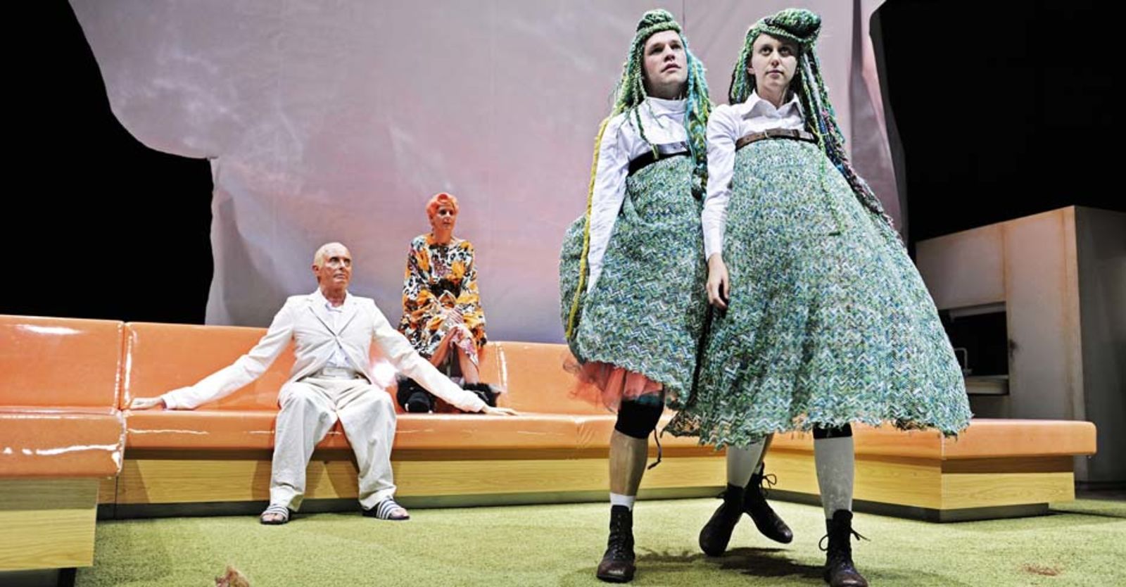 Daneben gibt es die überangepassten Immigranten, die Kovacics, von denen der Vater (Ludwig Boettger) seltsam verlängerte Arme hat, die ihm eine grössere Distanz zum Missbrauch seiner Töchter (Franziska Machens und Milian Zerzawy) erlauben, die wiederum an der Hüfte zusammengewachsen sind, als hätte sie die inzestuöse Ursuppe namens Familie so sehr zusammengeschweisst. Die möbelsexuelle Frau Kovacic (Miriam Maertens, eine tolle Komödiantin) hat ihre Haarfarbe auf das Lachsorange des Sofabezugs (Bühne: Bettina Meyer) abgestimmt und erklärt, das Ziel jeder „Liebesbefriedigung“ sei einzig, sich mit dem Geld des Gatten, des „Möbelverdieners“, neue Möbel zu kaufen. Herr Kovacic seinerseits zertritt erst den Familienhamster und befiehlt dann den Seinen: „Jetzt trinken wir uns in eine spassige Ablenkung hinein!“