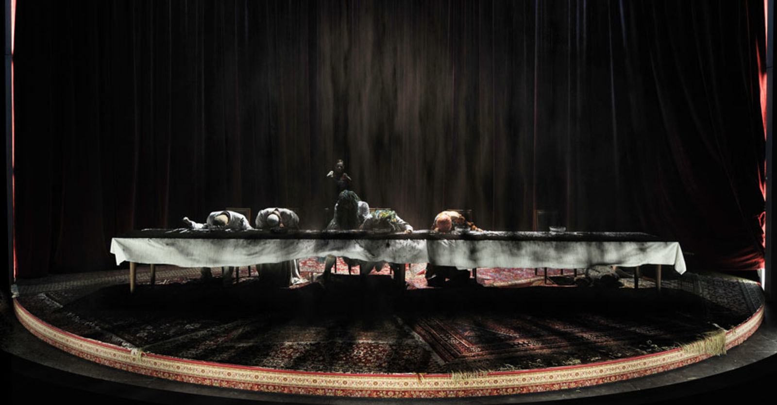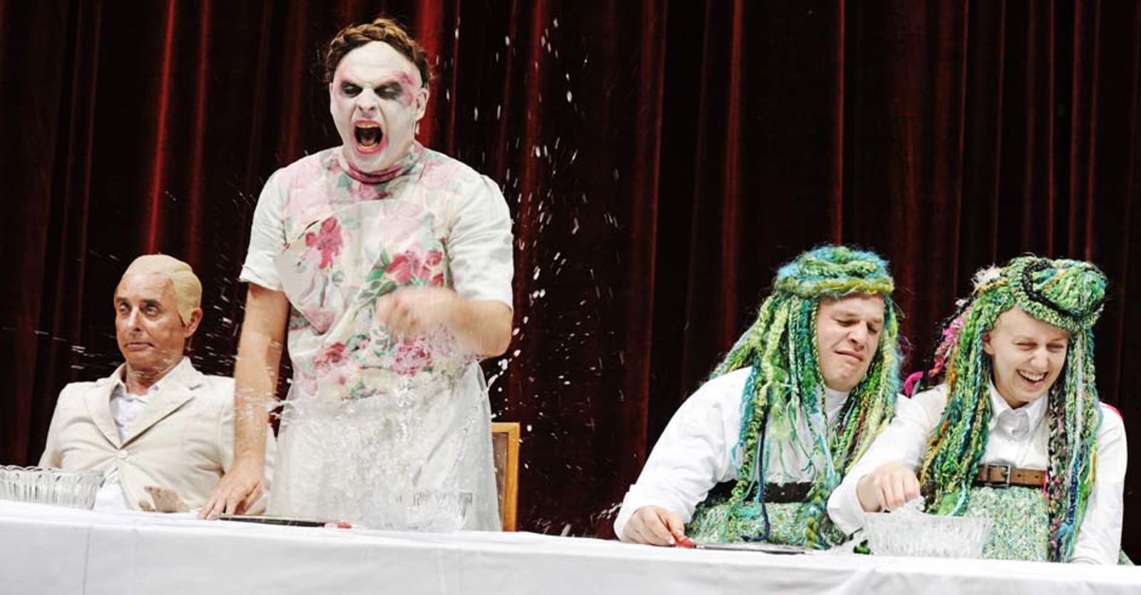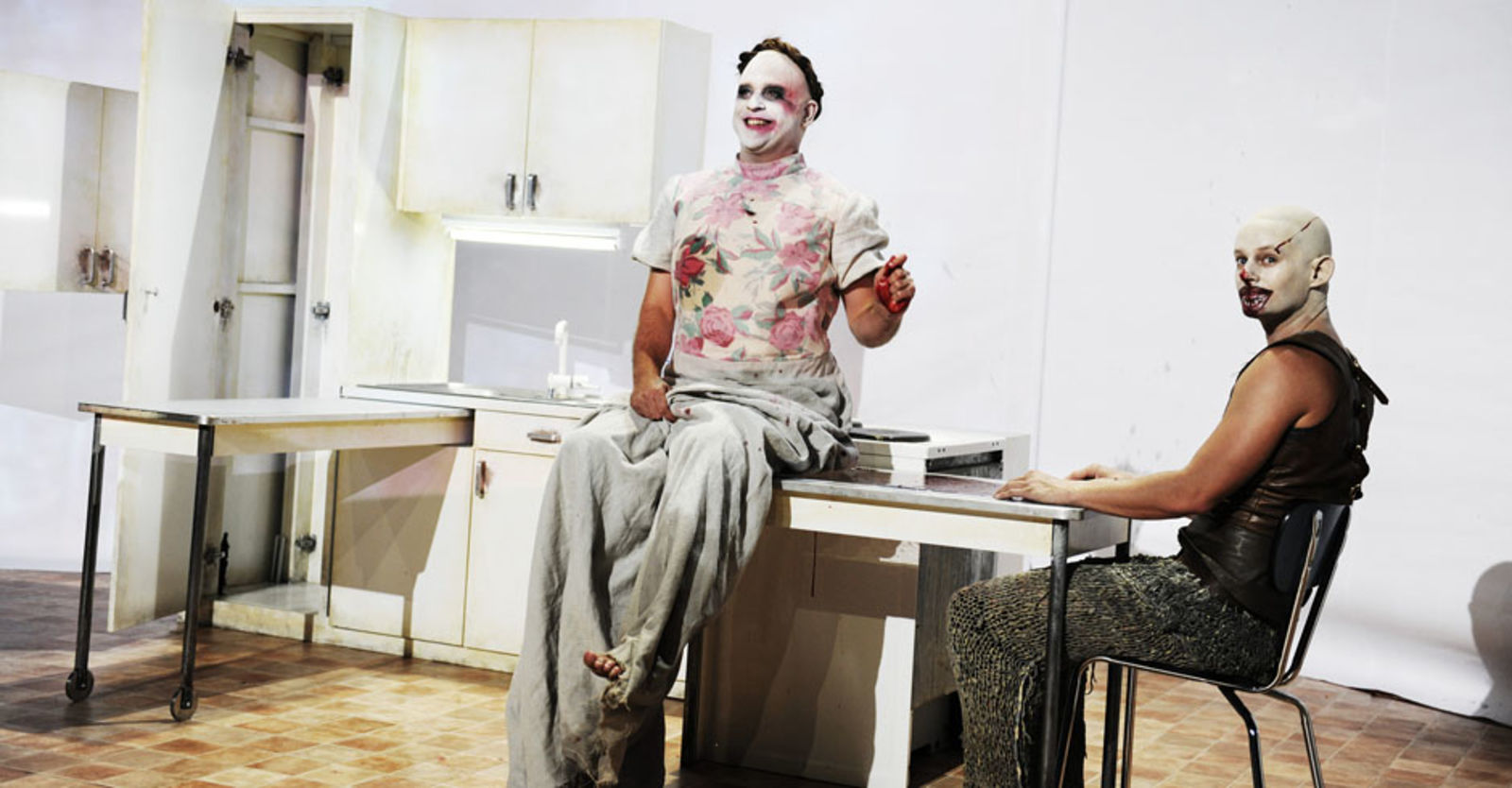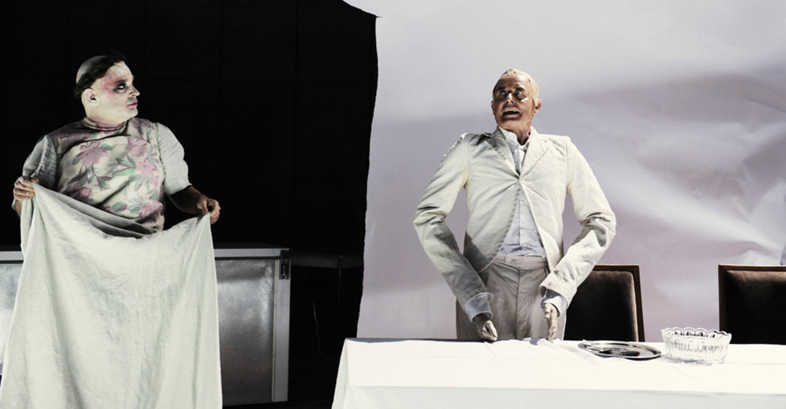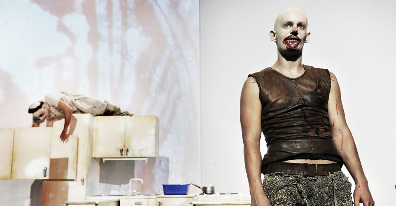 Ein Mietshaus mit drei Parteien: Im Souterrain wohnt Frau Wurm mit ihrem verkrüppelten Sohn Herrmann, darüber hat der grobschlächtige Herr Kovacic mit seiner Frau und den beiden Töchtern Desiree und Bianca seine Wohnung, Frau Grollfeuer komplementiert als Hausherrin die hierarchische Ansammlung an Menschenbestien in der Beletage. Sie taucht in eigenwillige Vernichtungsphantasien ein, denn: „Das furchtbarste was es geben kann, ist das Volk ...“ „Volksvernichtung“ (1991) ist eines der bekanntesten Stücke Werner Schwabs. Regie führte Heike M. Goetze, die 2009 im Pfauen „Warum läuft Herr R. Amok?“ und 2010 in der Box „Stiller“ inszenierte.