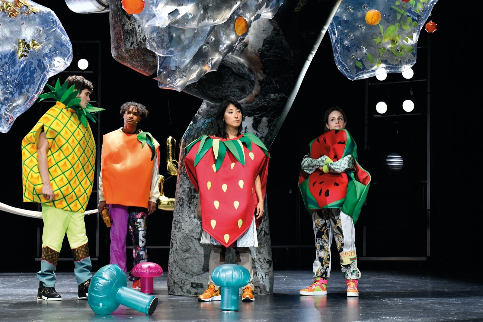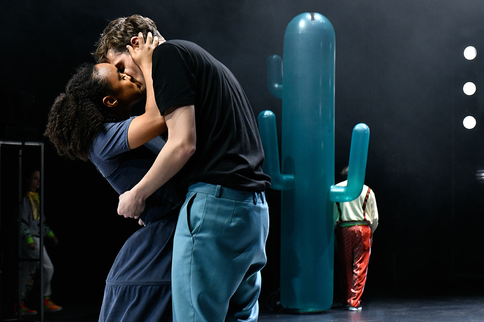 «Optisch ist das Ensemble streng geteilt: in das schlichte Einheitsblau der Farmerfamilie und den bunten Label-Fetisch-Mix der pfauenhaften Gucci-Gang, die den Takt vorgibt (Kostüme Lene Schwind). Das Sehnsuchtsland Kalifornien ist mit aufblasbaren Riesenkakteen und Orangenbäumen garniert (Bühne: Jonathan Mertz). Alles Luft.» (Republik, 29.10.2019)